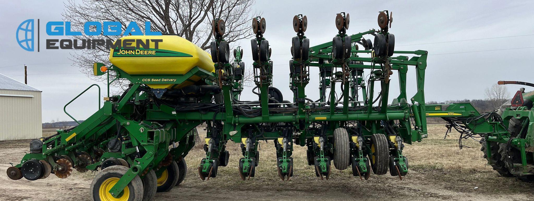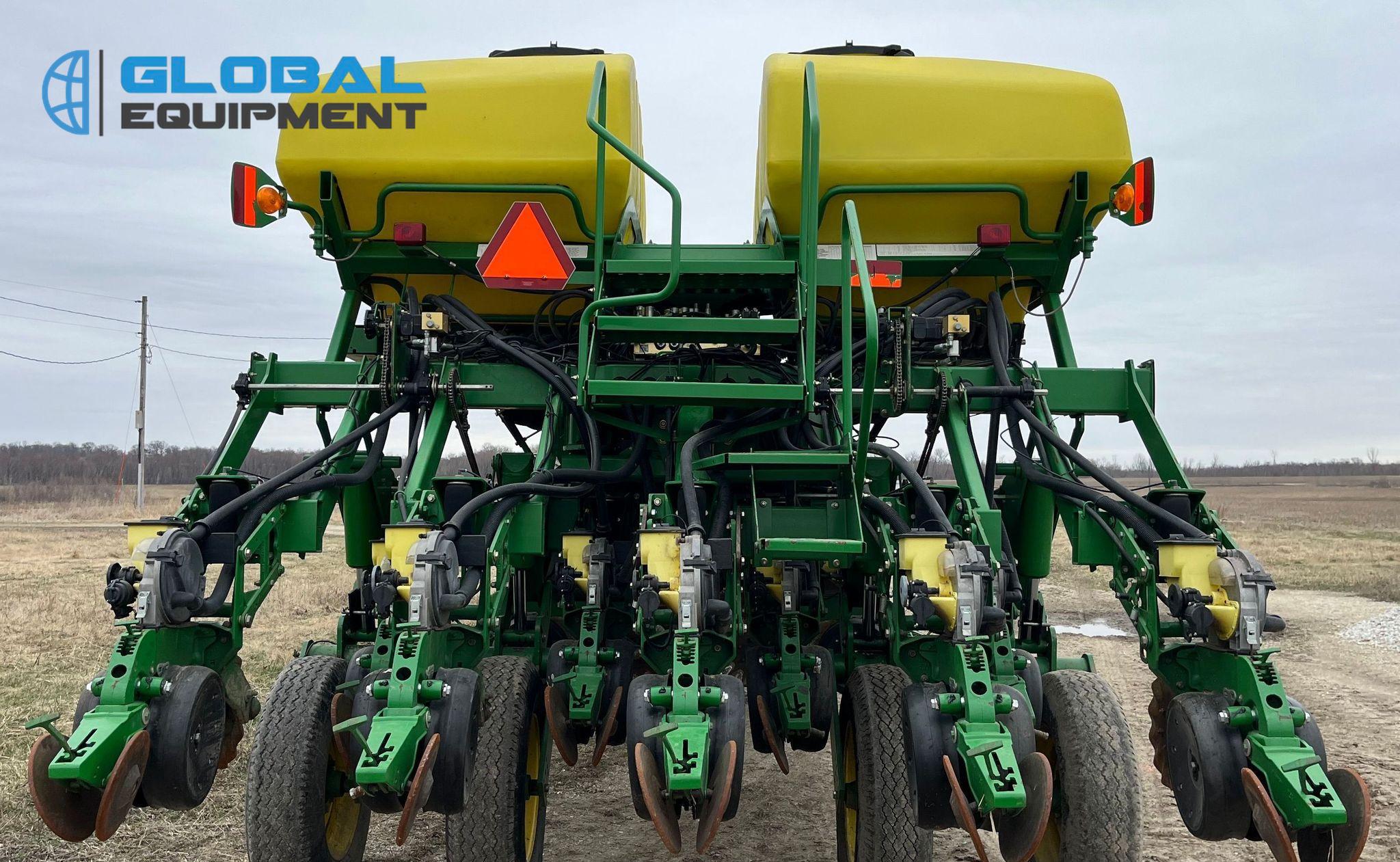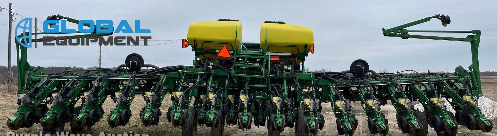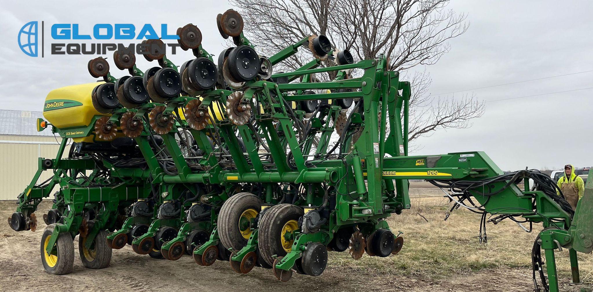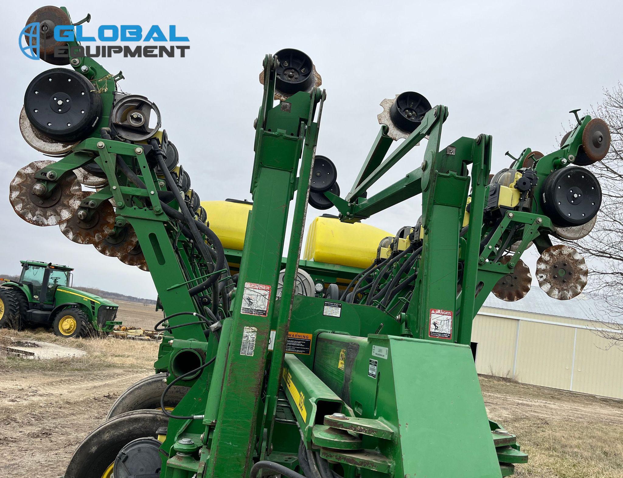 2009 John Deere 1790 planter, 31 Row Units on 15" Spacing with 16 Split Row Units at 30" Spacing, Equipped with Two-Point Hitch, Marker Arms, Hydraulic Front-Fold Frame, Bulk Fill Seed Delivery, Vacuum Metering with Electric Drive, Corn and Soybean Seed Meters, Pneumatic Down Pressure, No-Till Coulters, Double Disk Openers, Double Gauge Wheels, and Cast Double Closing System. Includes John Deere Control Box. Riding on (4) 11-22.5 Transport Tires and (4) 10.00-15 Drive/Outside Tires.