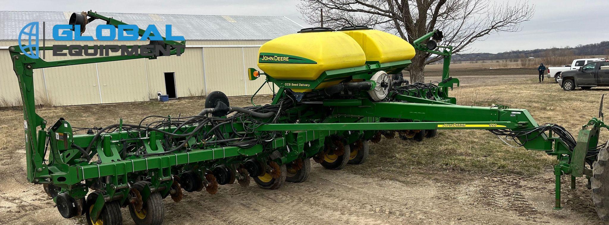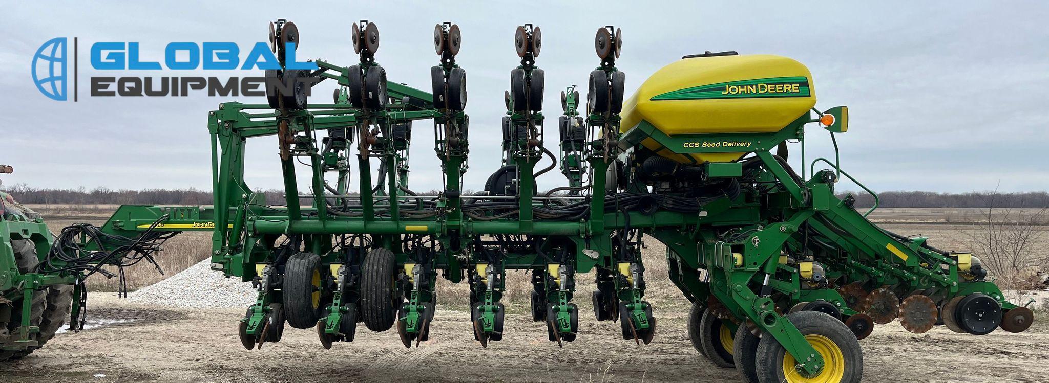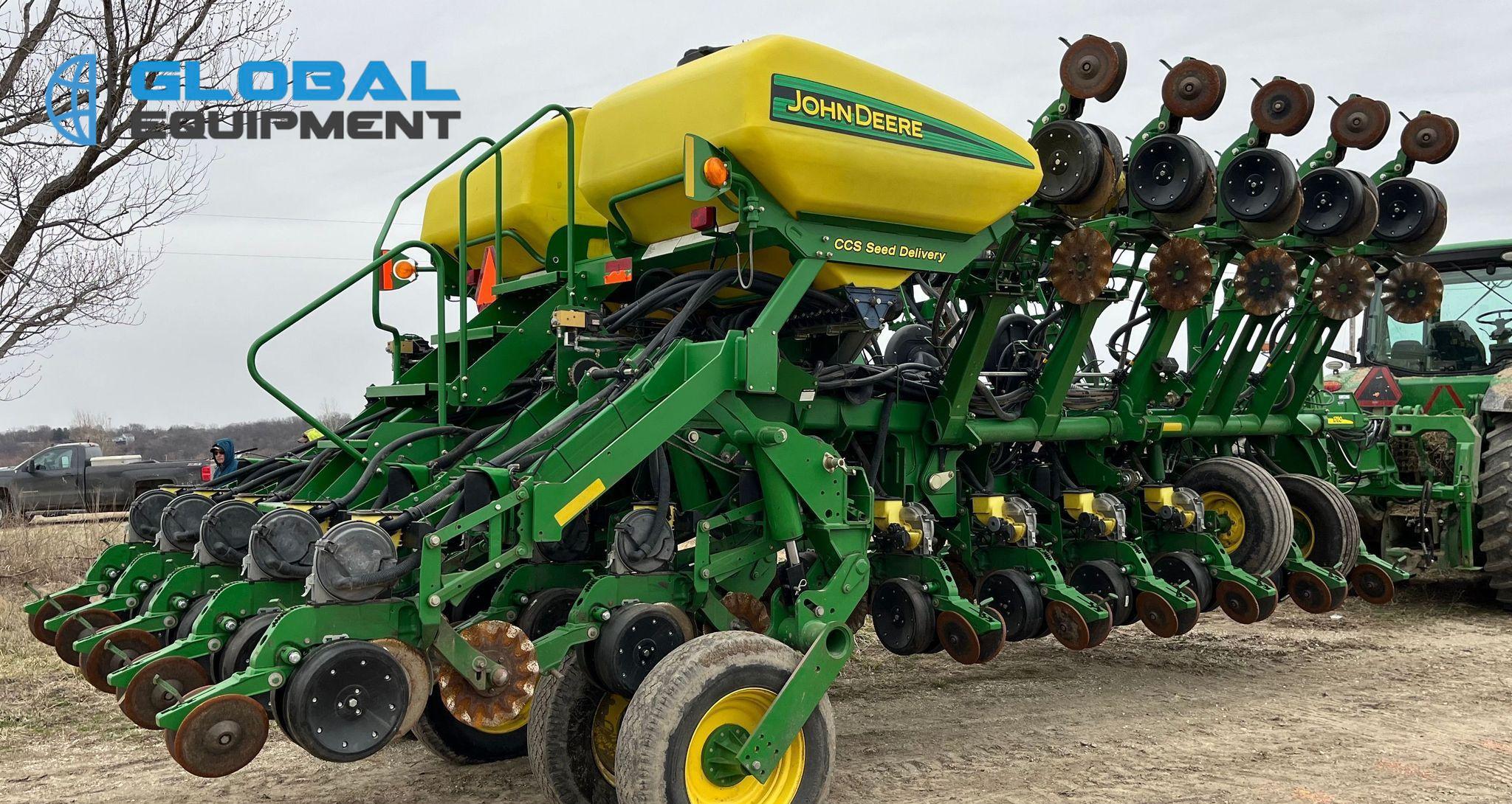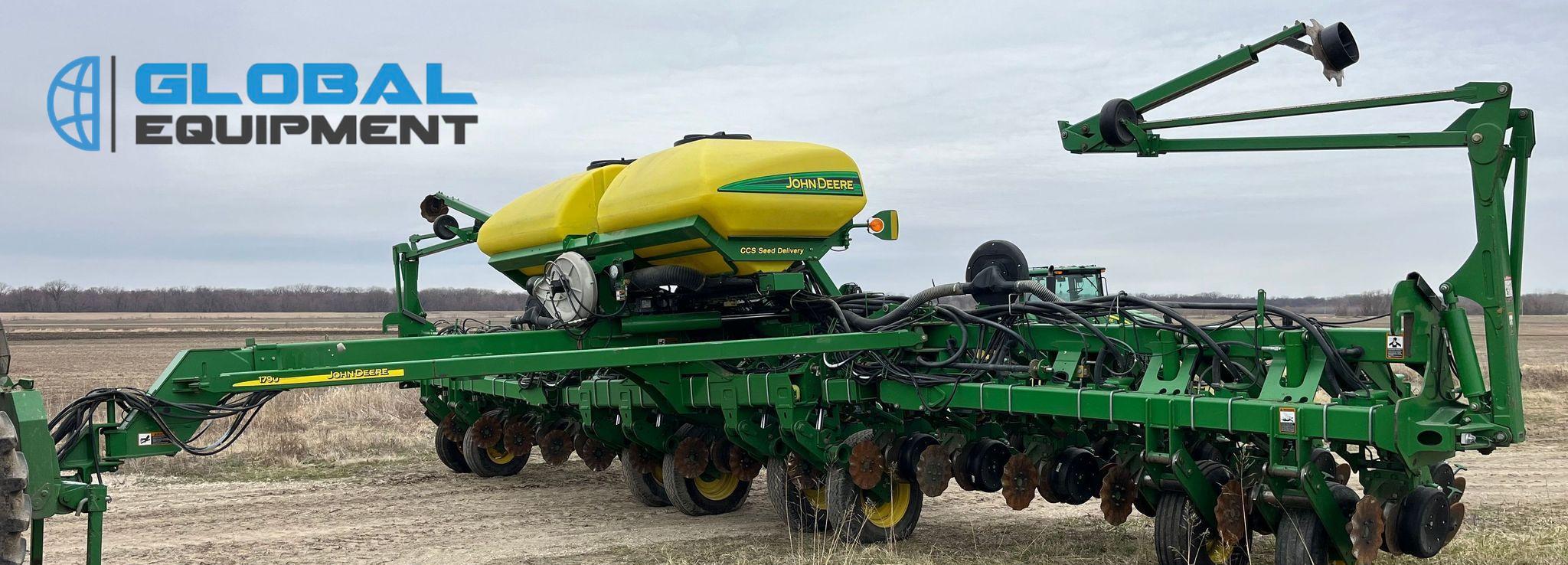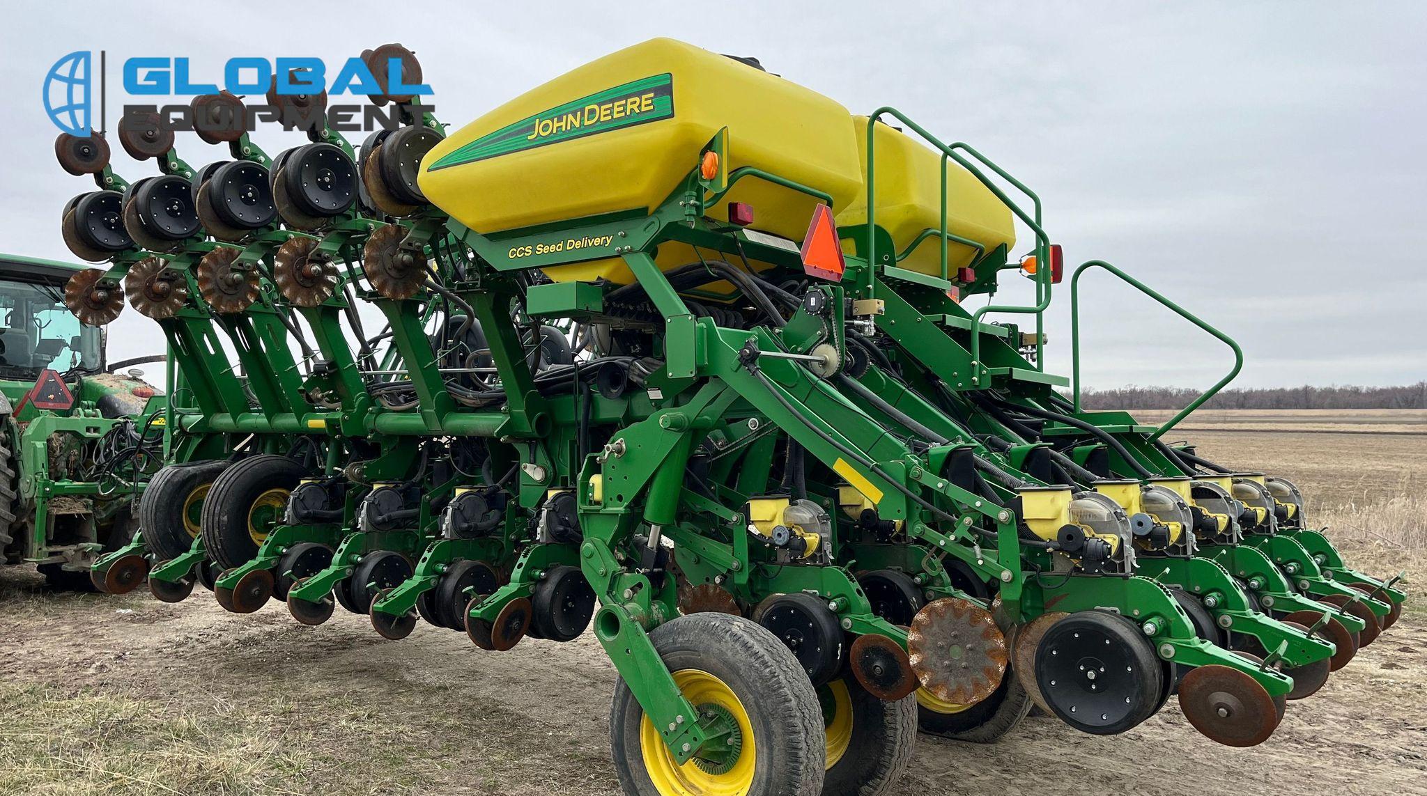 2009 John Deere 1790 planter, 31 Row Units on 15" Spacing with 16 Split Row Units at 30" Spacing, Equipped with Two-Point Hitch, Marker Arms, Hydraulic Front-Fold Frame, Bulk Fill Seed Delivery, Vacuum Metering with Electric Drive, Corn and Soybean Seed Meters, Pneumatic Down Pressure, No-Till Coulters, Double Disk Openers, Double Gauge Wheels, and Cast Double Closing System. Includes John Deere Control Box. Riding on (4) 11-22.5 Transport Tires and (4) 10.00-15 Drive/Outside Tires.