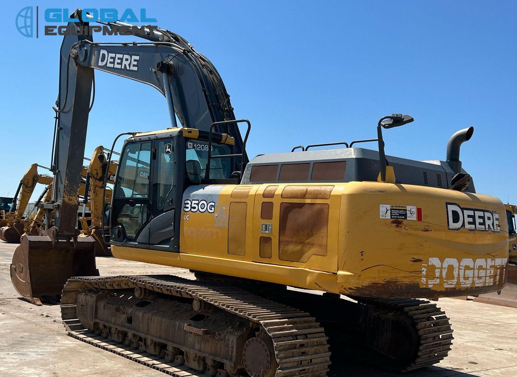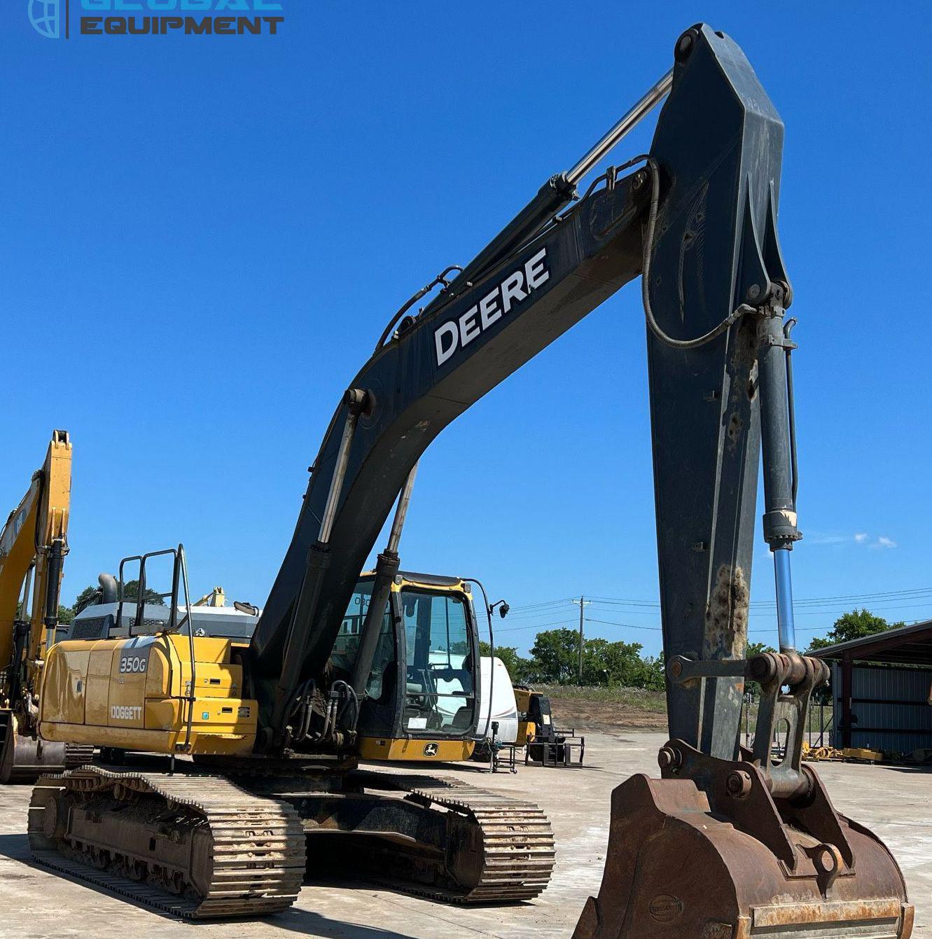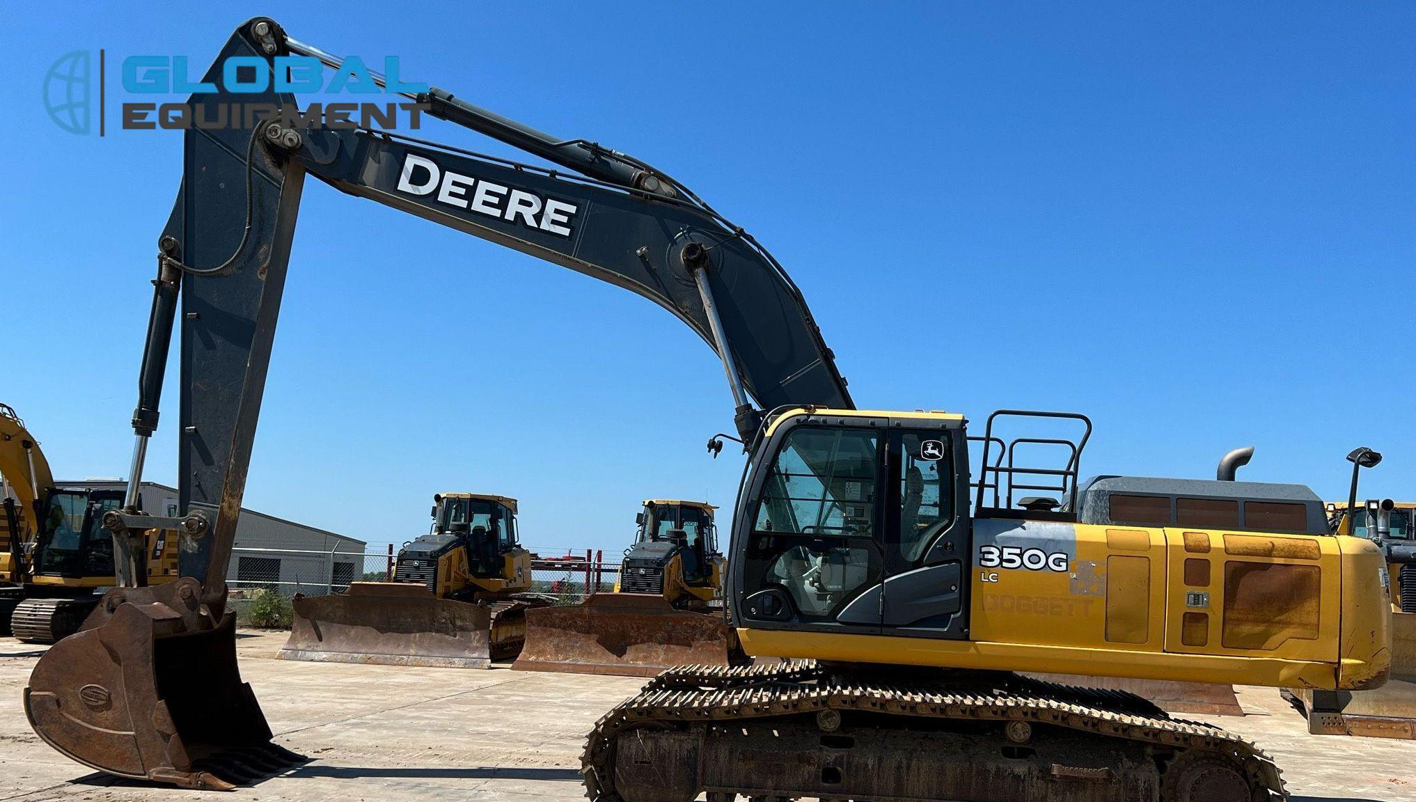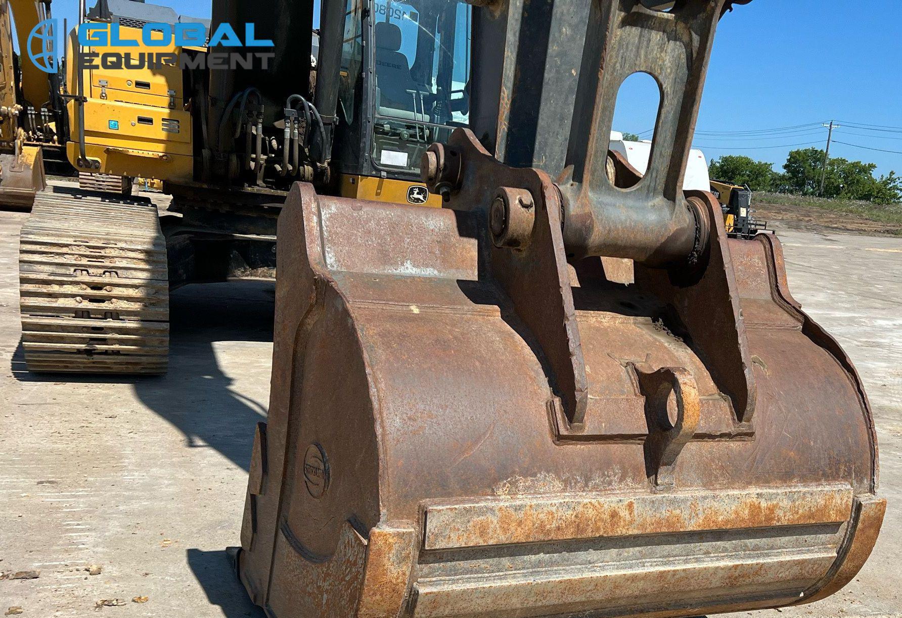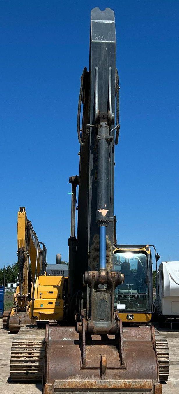 2017 John Deere 350G LC excavator, 4,557 Hours on meter, Hydrostatic Transmission with Two-Speed Travel, Enclosed Cab with AC and Heat, Equipped with Pattern Changer, Standard Boom, 64" Bucket with 6 Teeth, and 32" Wide Steel Tracks with Triple Grouser Pads.