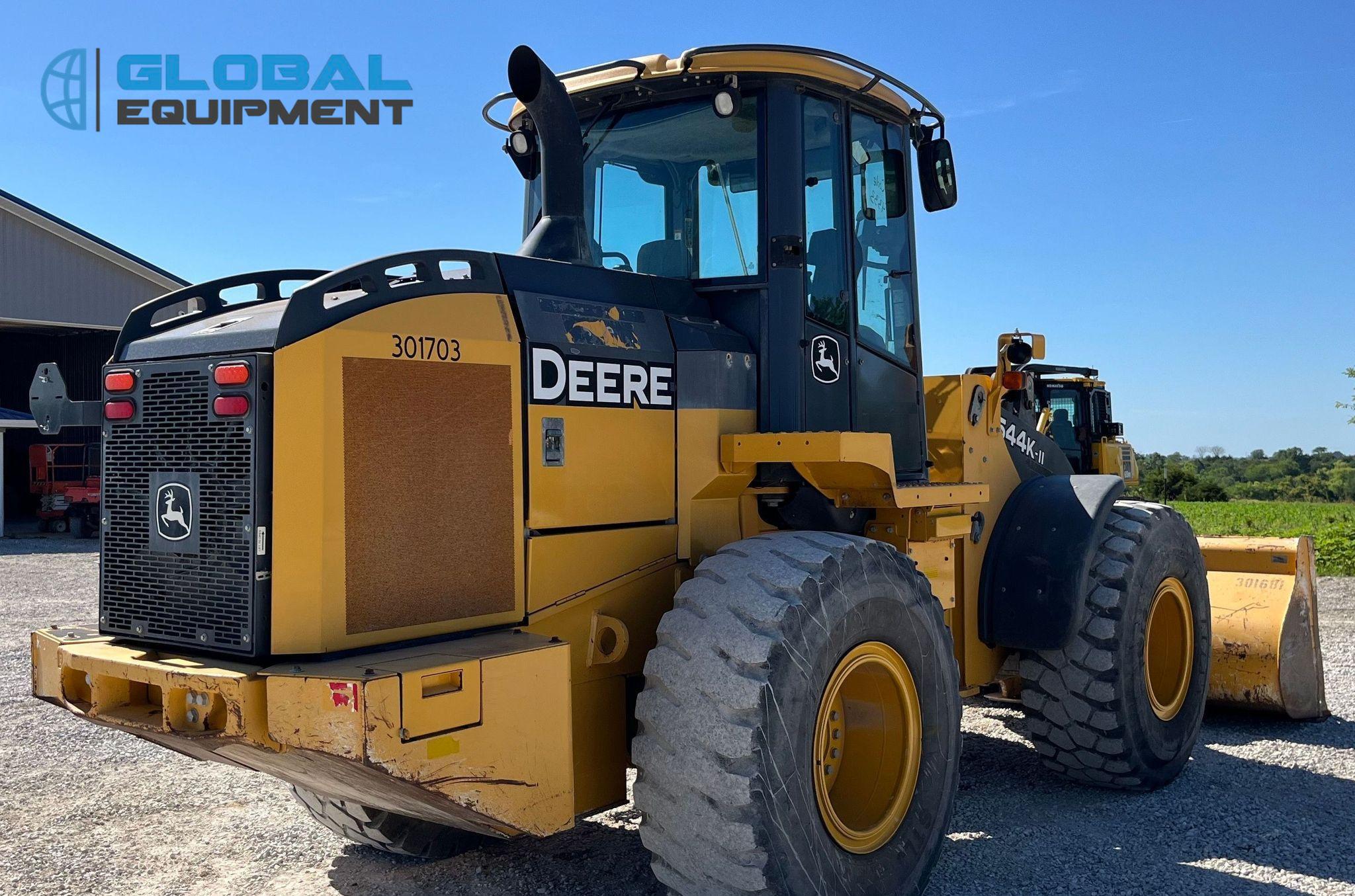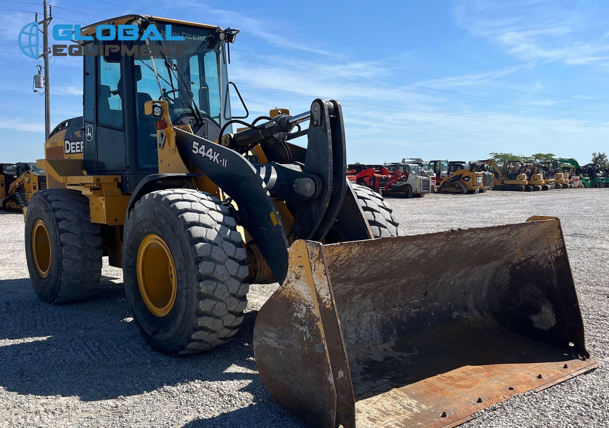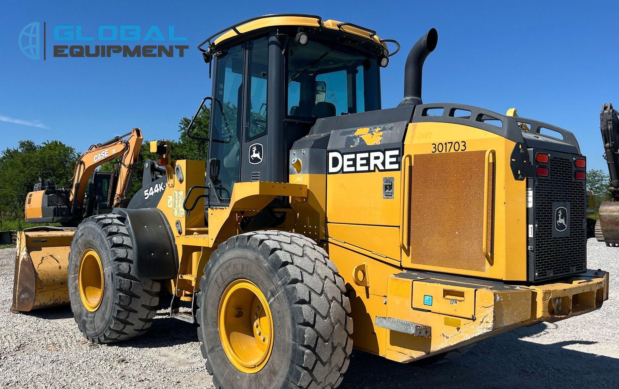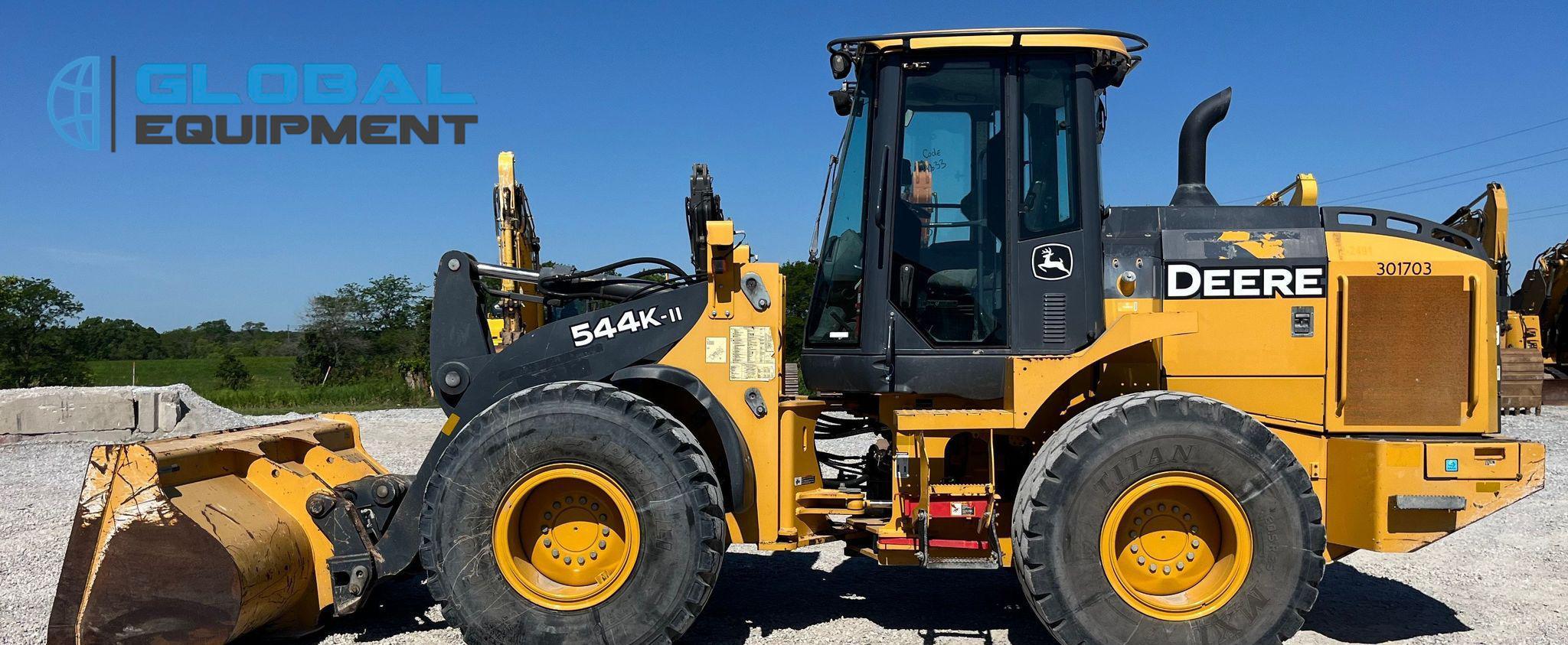2017 John Deere 544K-II wheel loader, 6,797 Hours on meter, Powershift Transmission, Enclosed Cab with AC and Heat, Joystick Bucket Controls, Ride Control, Hydraulic Quick Coupler, Equipped with 105.5" Self-Leveling Bucket (Bolt-on Cutting Edge). Riding on 20.5R25 Tires.