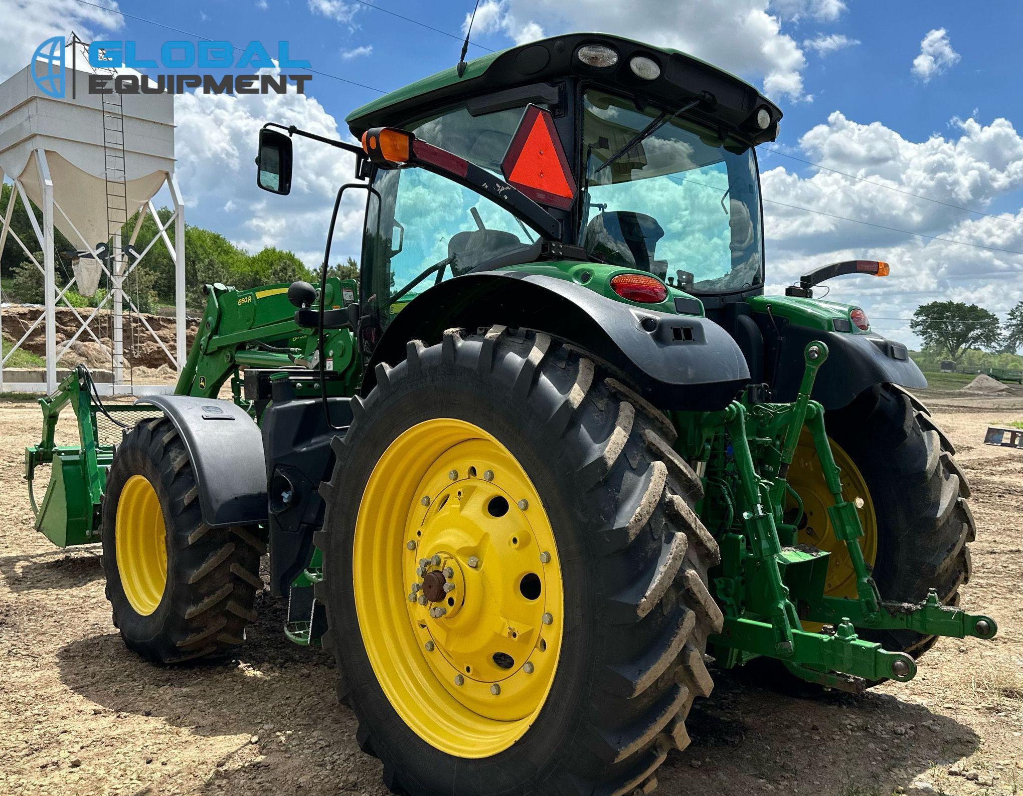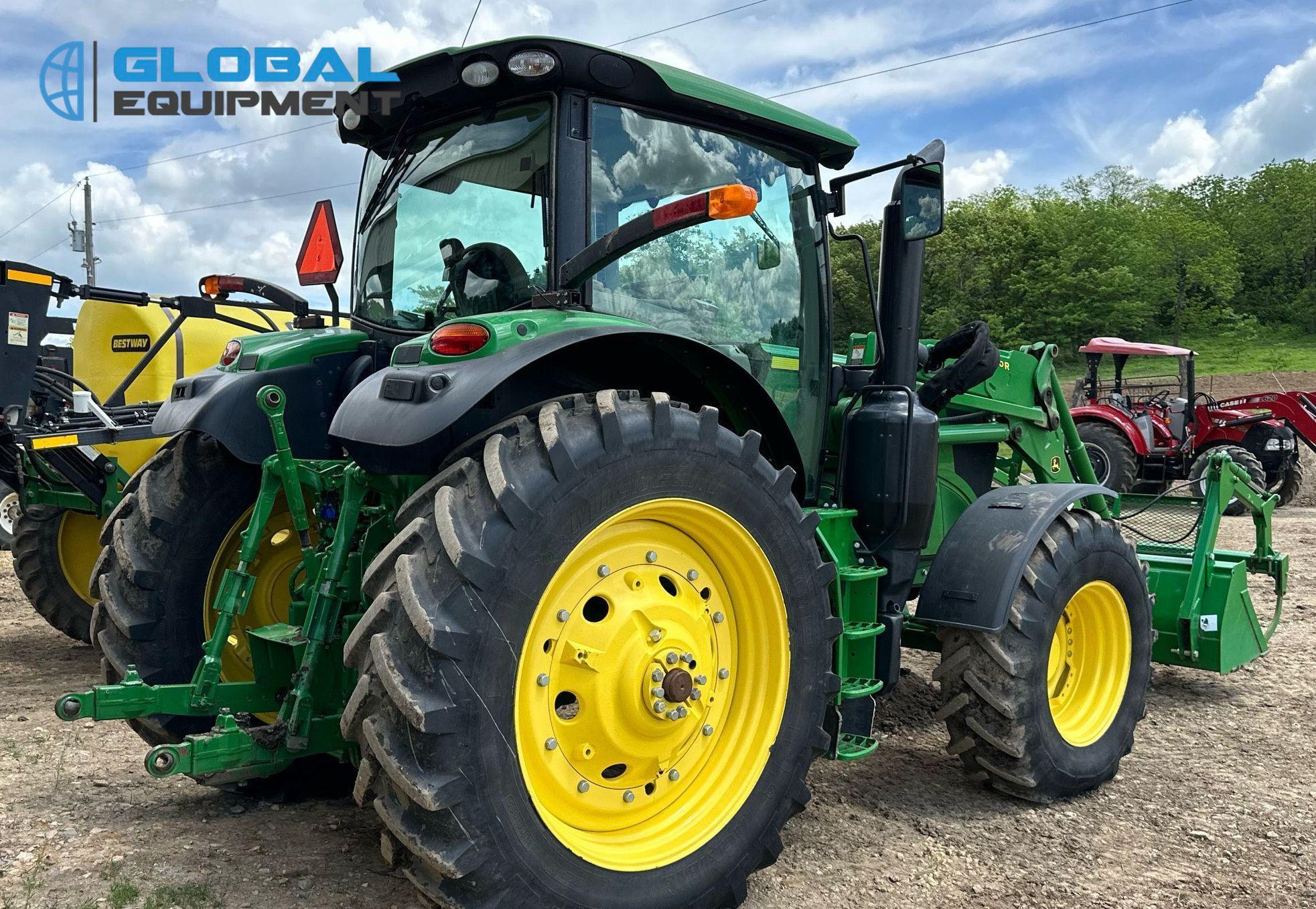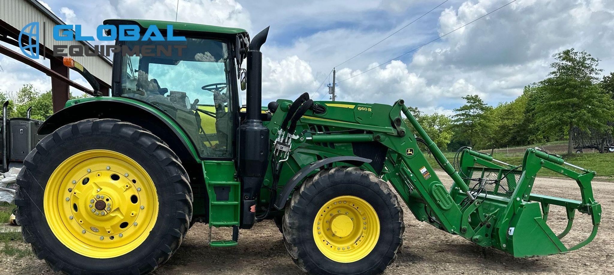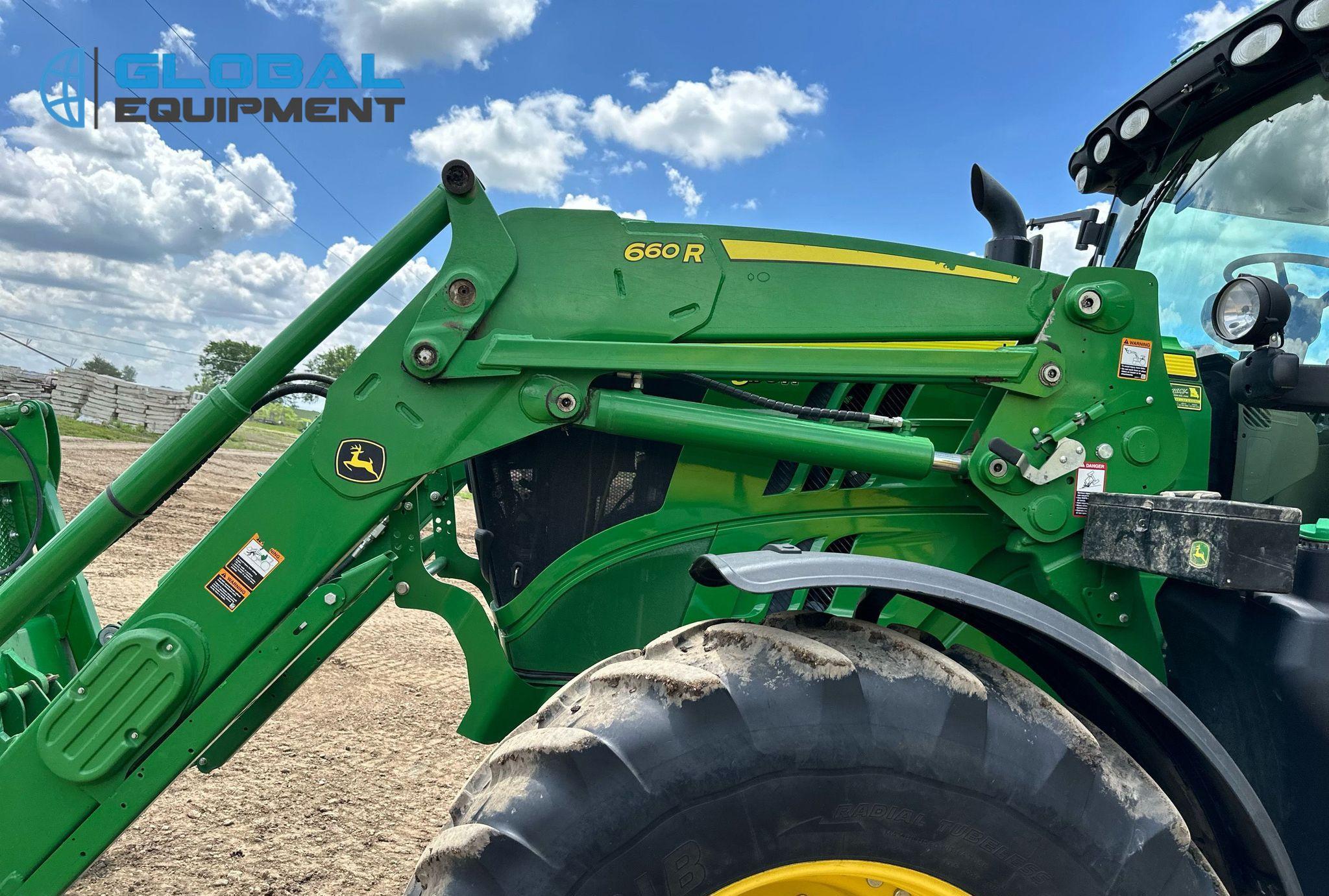 2017 John Deere 6175R MFWD tractor, 2,314 Hours on meter, Powershift Transmission (24F - 24R) with Left-Hand Reverser and Differential Lock, Enclosed Cab with AC and Heat, Equipped with 540/1000 PTO, Three-Point Hitch with Top Link, 7-Pin Outlet, ISOBUS Outlet, 3 Rear Hydraulic Remote Sets, Loader Ready, and John Deere 660R Loader with Self-Leveling and Joystick Controls. Riding on Front 420/90R30 and Rear 18.4-46 Tires.