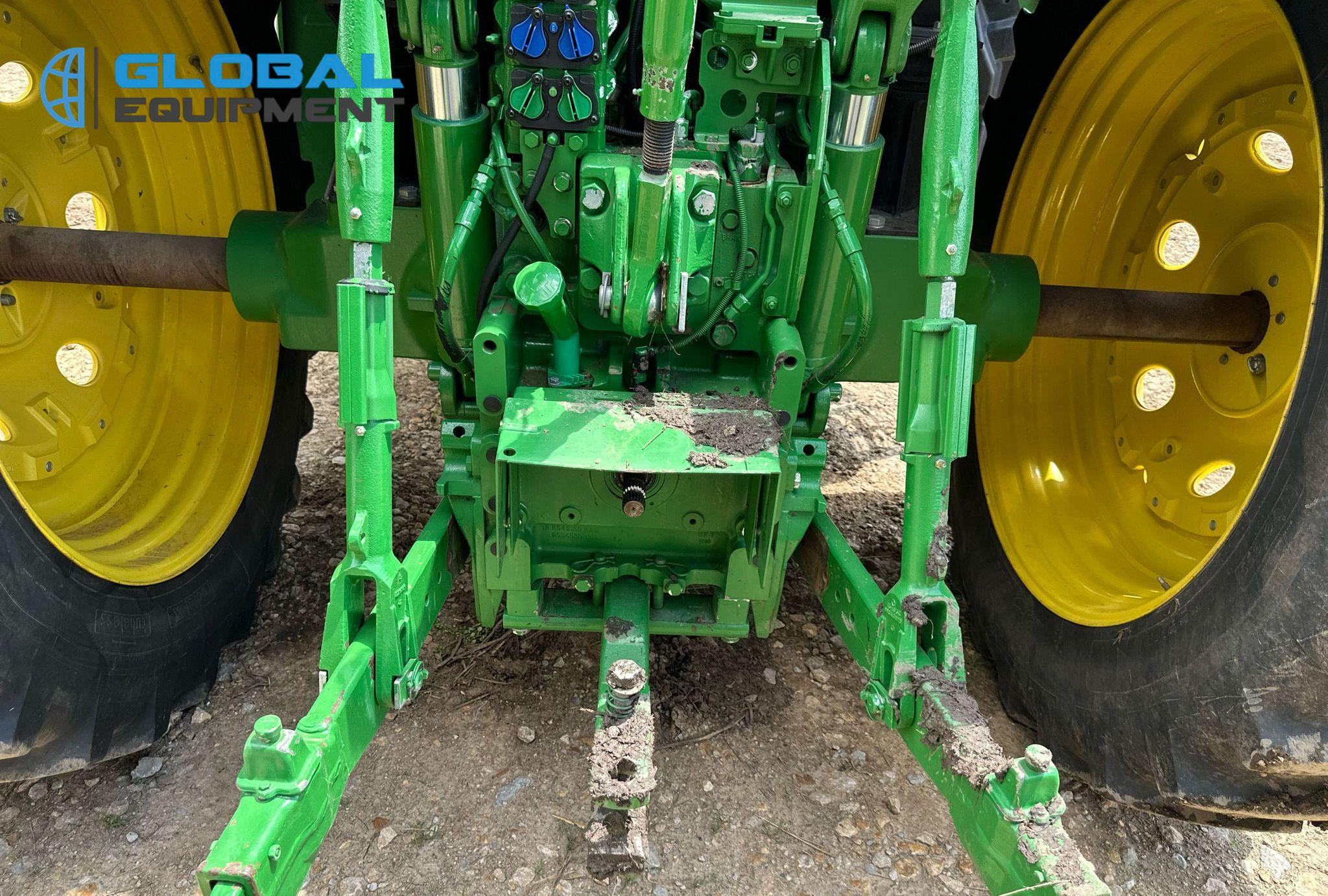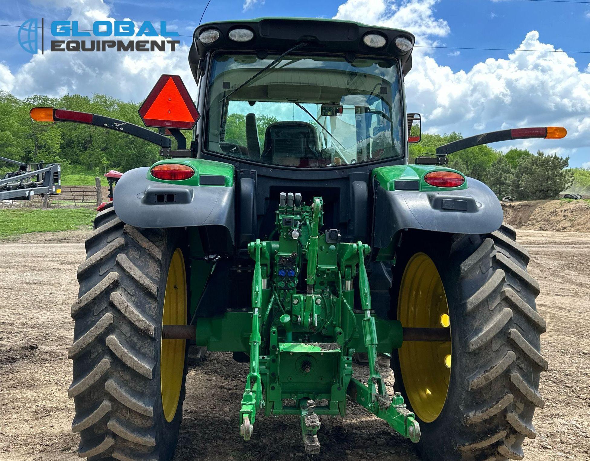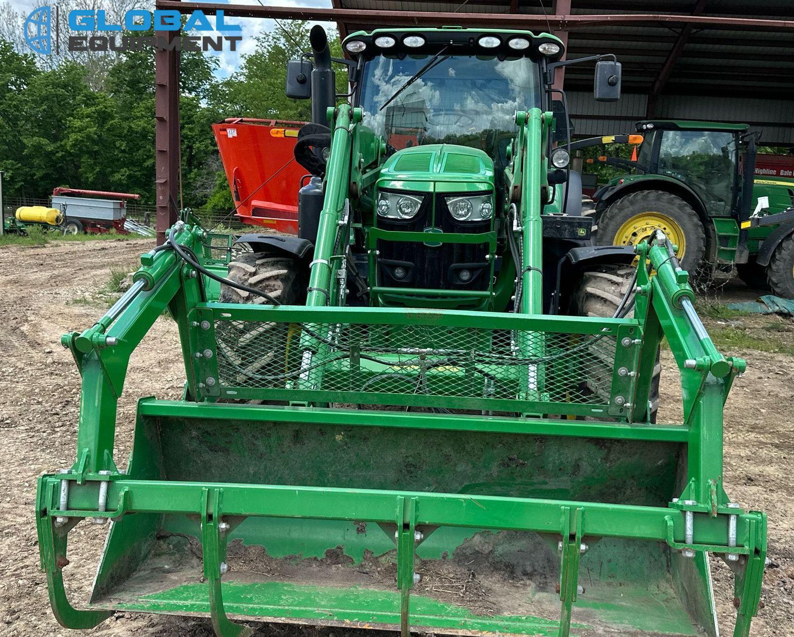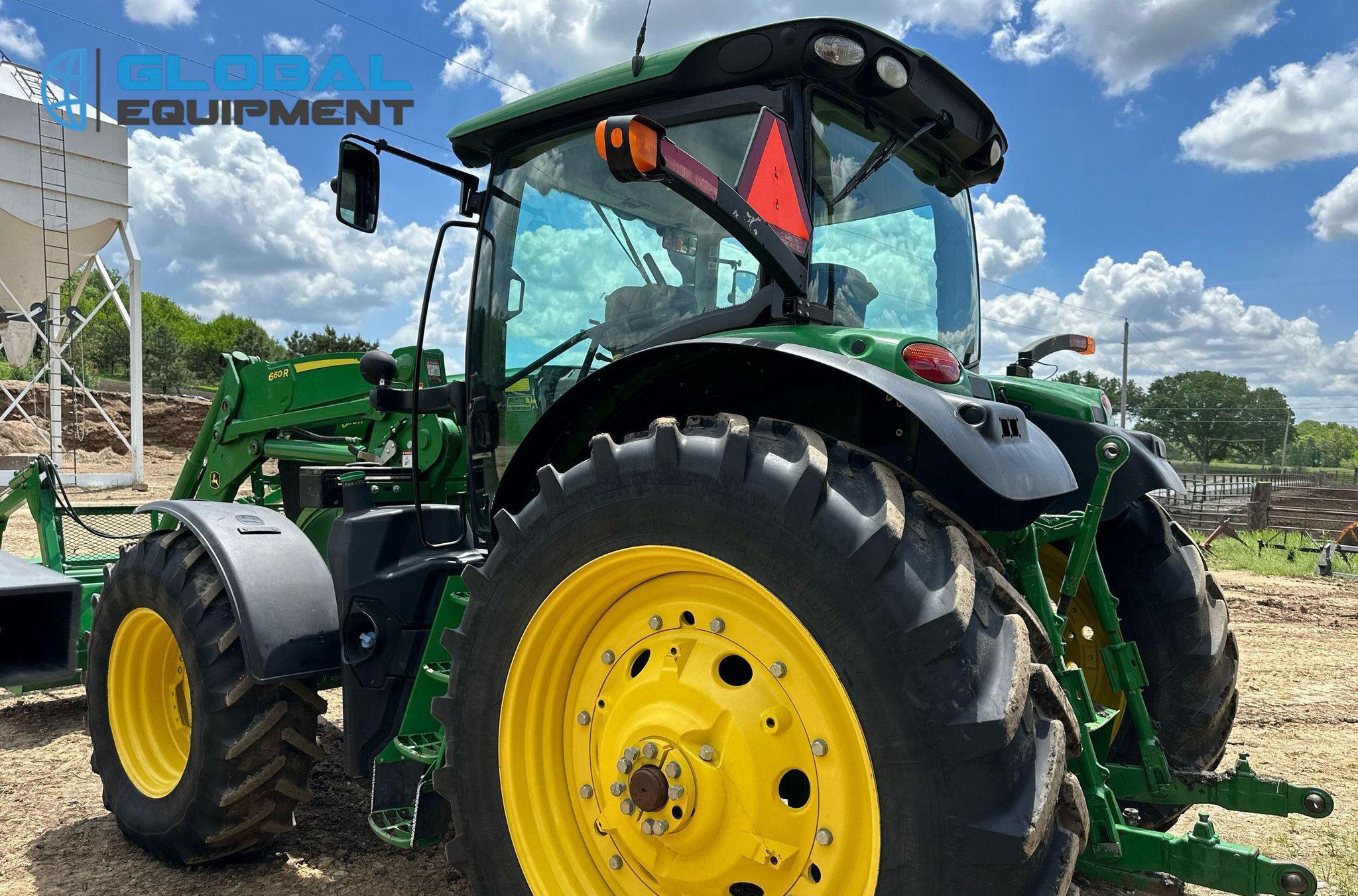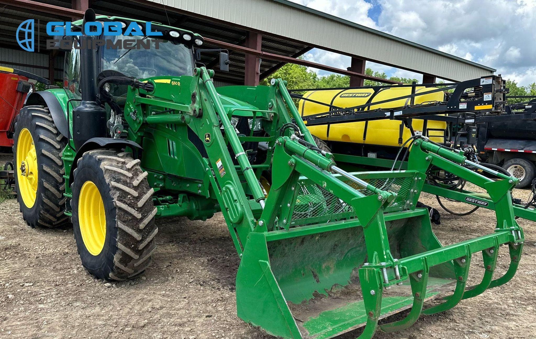 2017 John Deere 6175R MFWD tractor, 2,314 Hours on meter, Powershift Transmission (24F - 24R) with Left-Hand Reverser and Differential Lock, Enclosed Cab with AC and Heat, Equipped with 540/1000 PTO, Three-Point Hitch with Top Link, 7-Pin Outlet, ISOBUS Outlet, 3 Rear Hydraulic Remote Sets, Loader Ready, and John Deere 660R Loader with Self-Leveling and Joystick Controls. Riding on Front 420/90R30 and Rear 18.4-46 Tires.