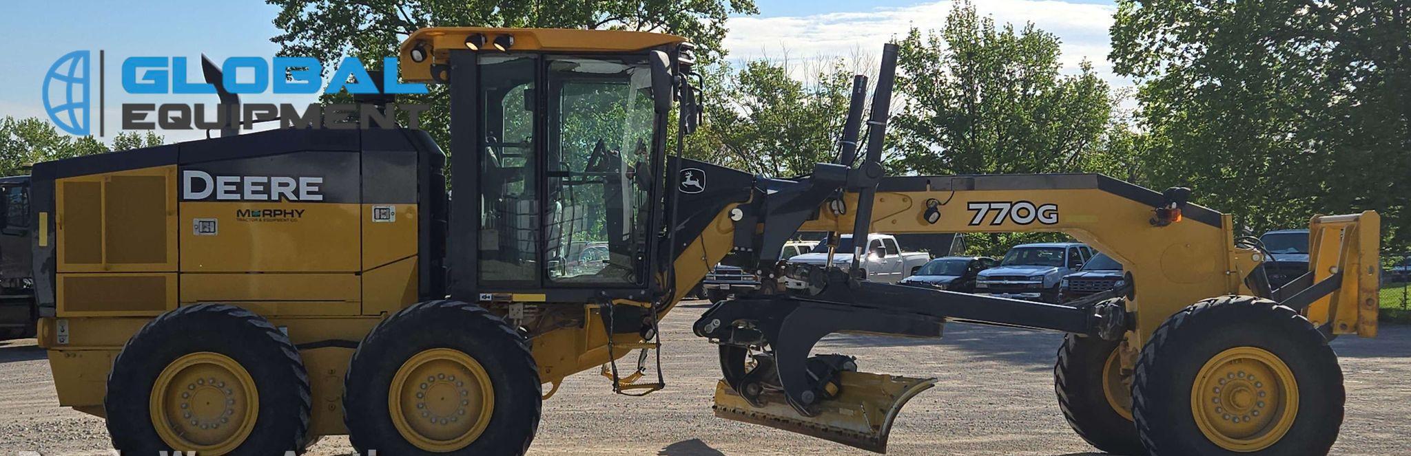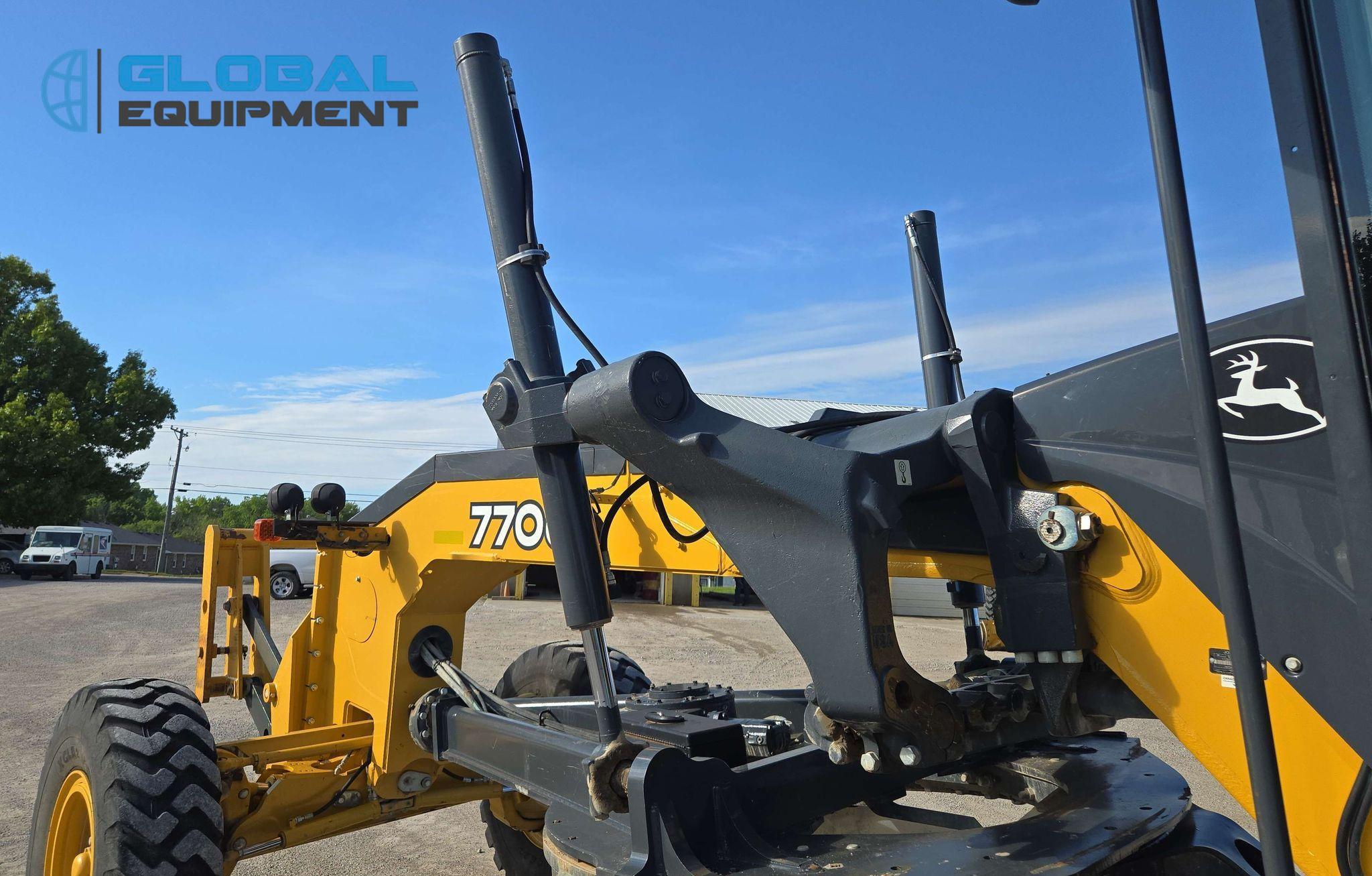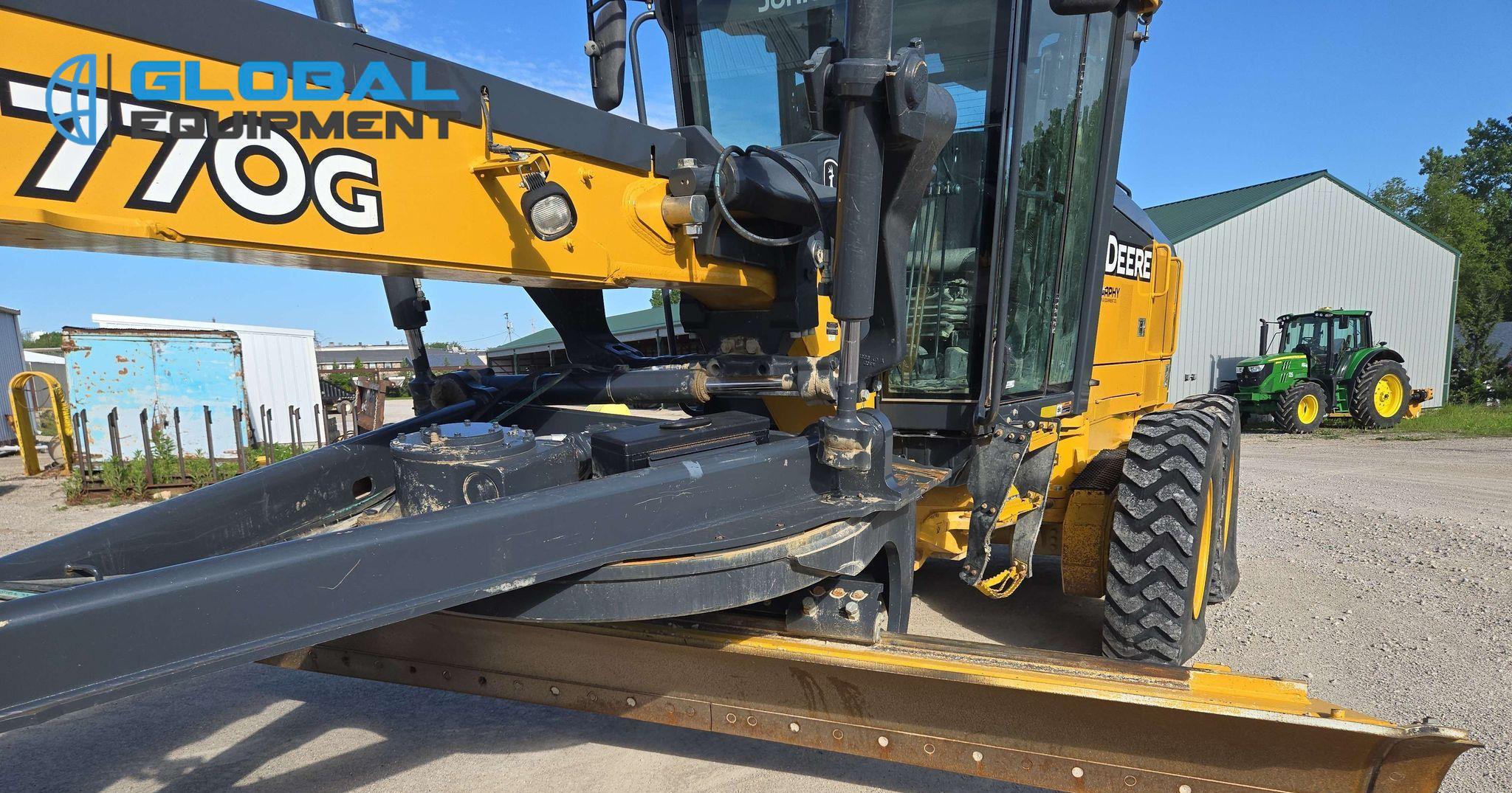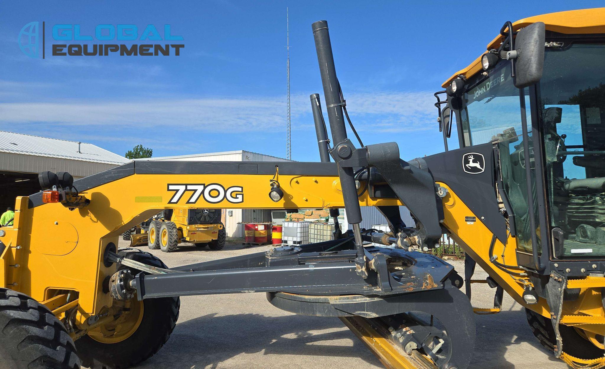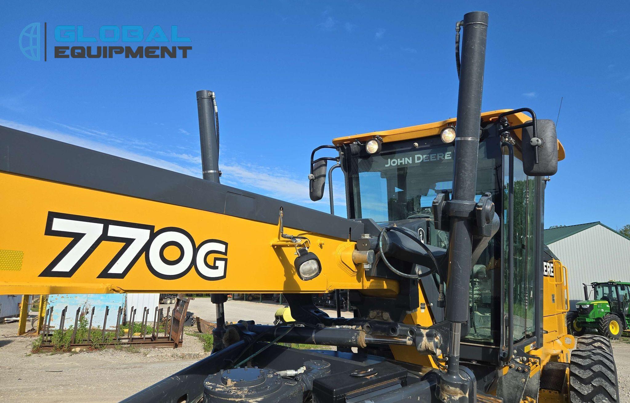 2018 John Deere 770G motor grader, 7,057 Hours on meter, Powershift Transmission (8F - 8R), Enclosed Cab with AC, Heat, and Backup Camera, Equipped with 10 Hydraulic Control Valves, Differential Lock, and Front-Mounted Lift Group. Features 14' Moldboard with Tip Control and Side Shift. Riding on 14.00R24 Tires.