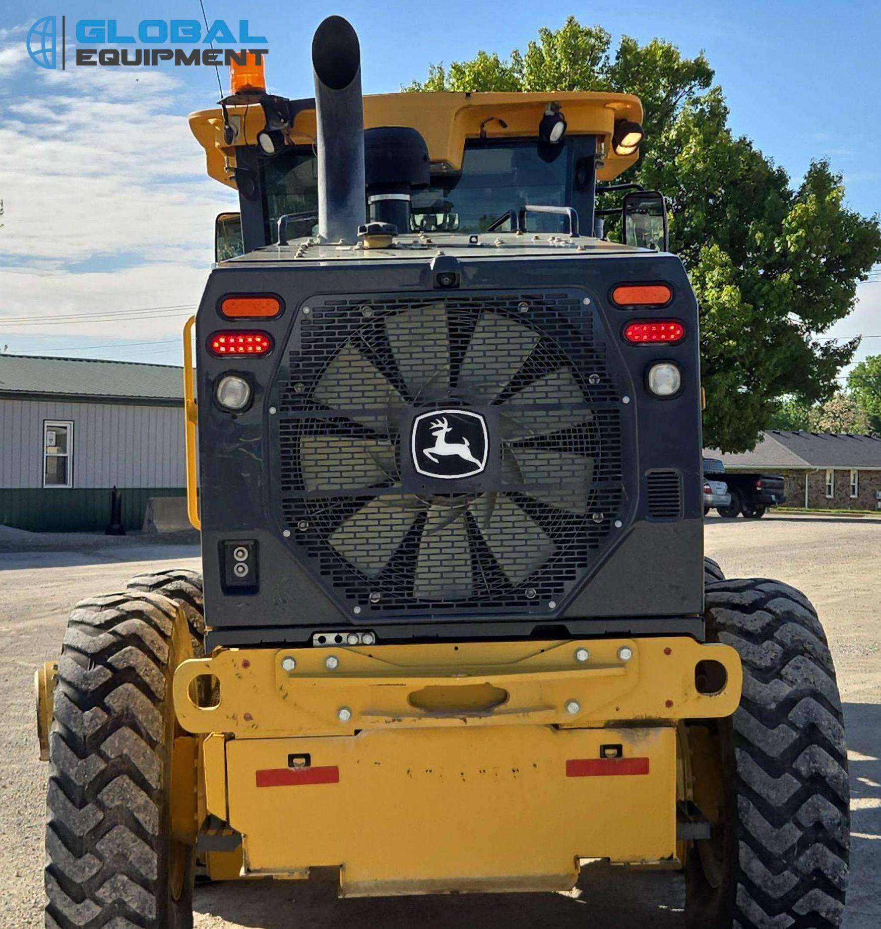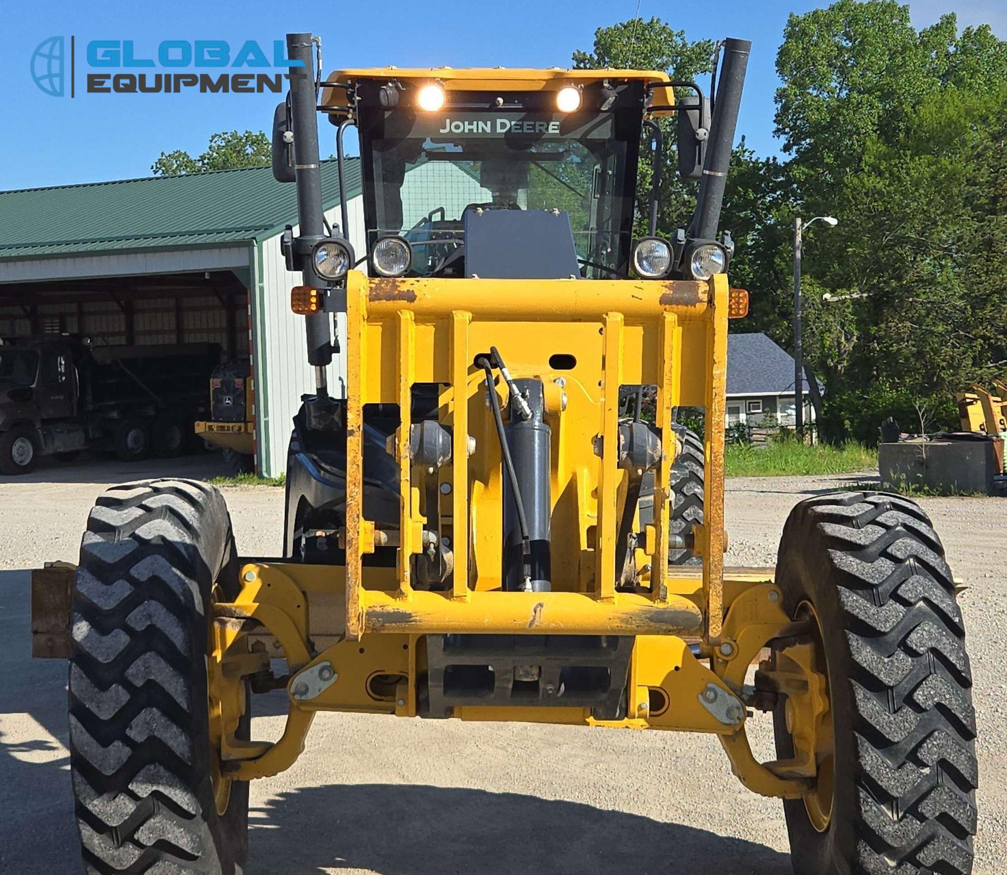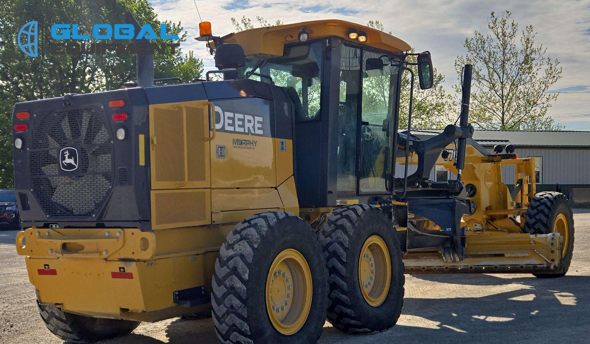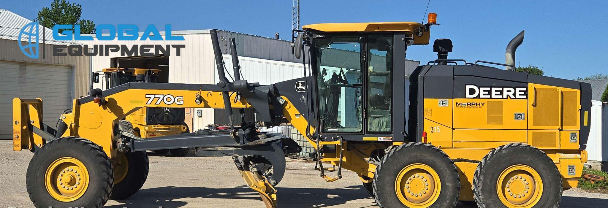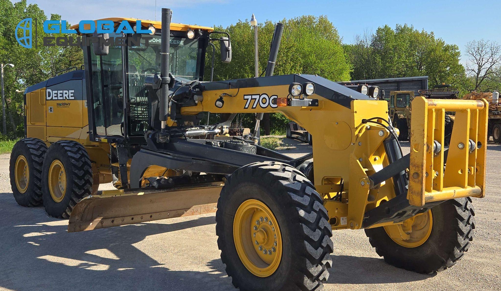 2018 John Deere 770G motor grader, 7,057 Hours on meter, Powershift Transmission (8F - 8R), Enclosed Cab with AC, Heat, and Backup Camera, Equipped with 10 Hydraulic Control Valves, Differential Lock, and Front-Mounted Lift Group. Features 14' Moldboard with Tip Control and Side Shift. Riding on 14.00R24 Tires.