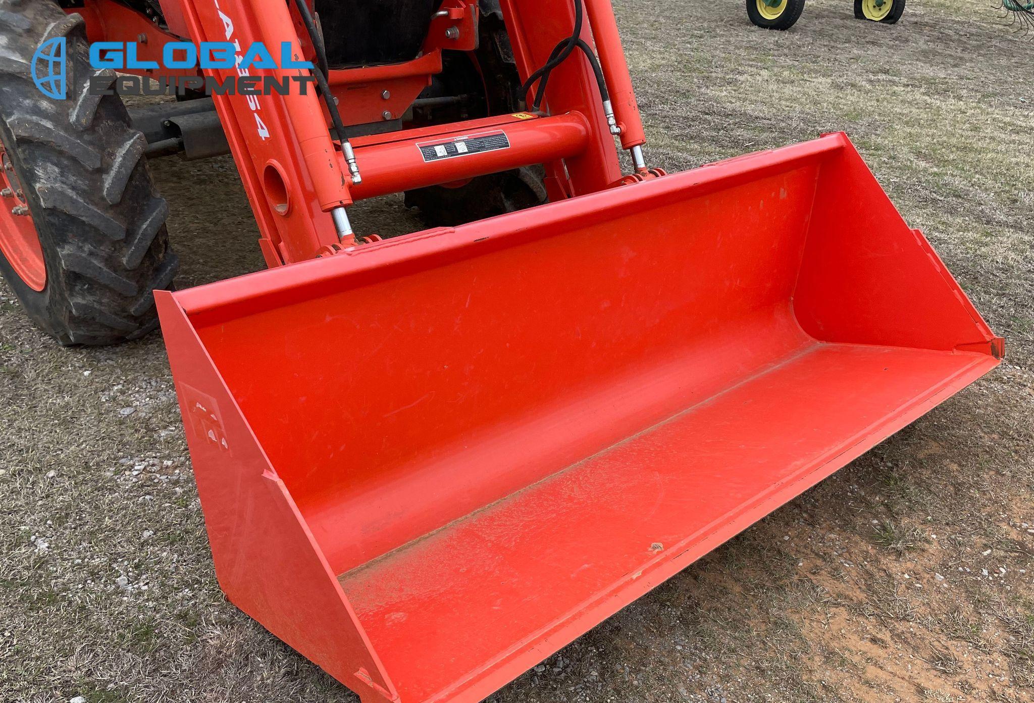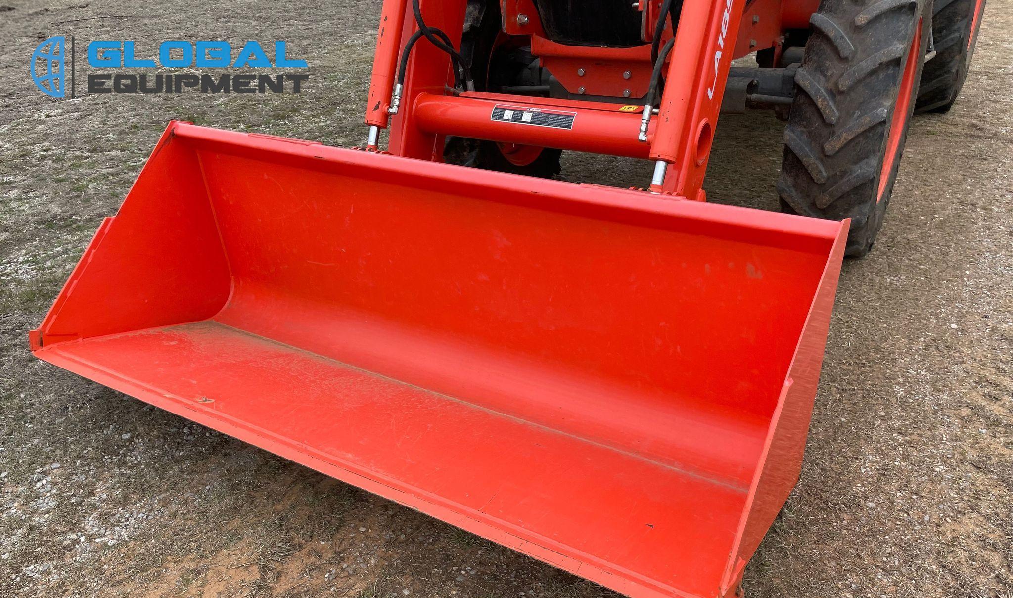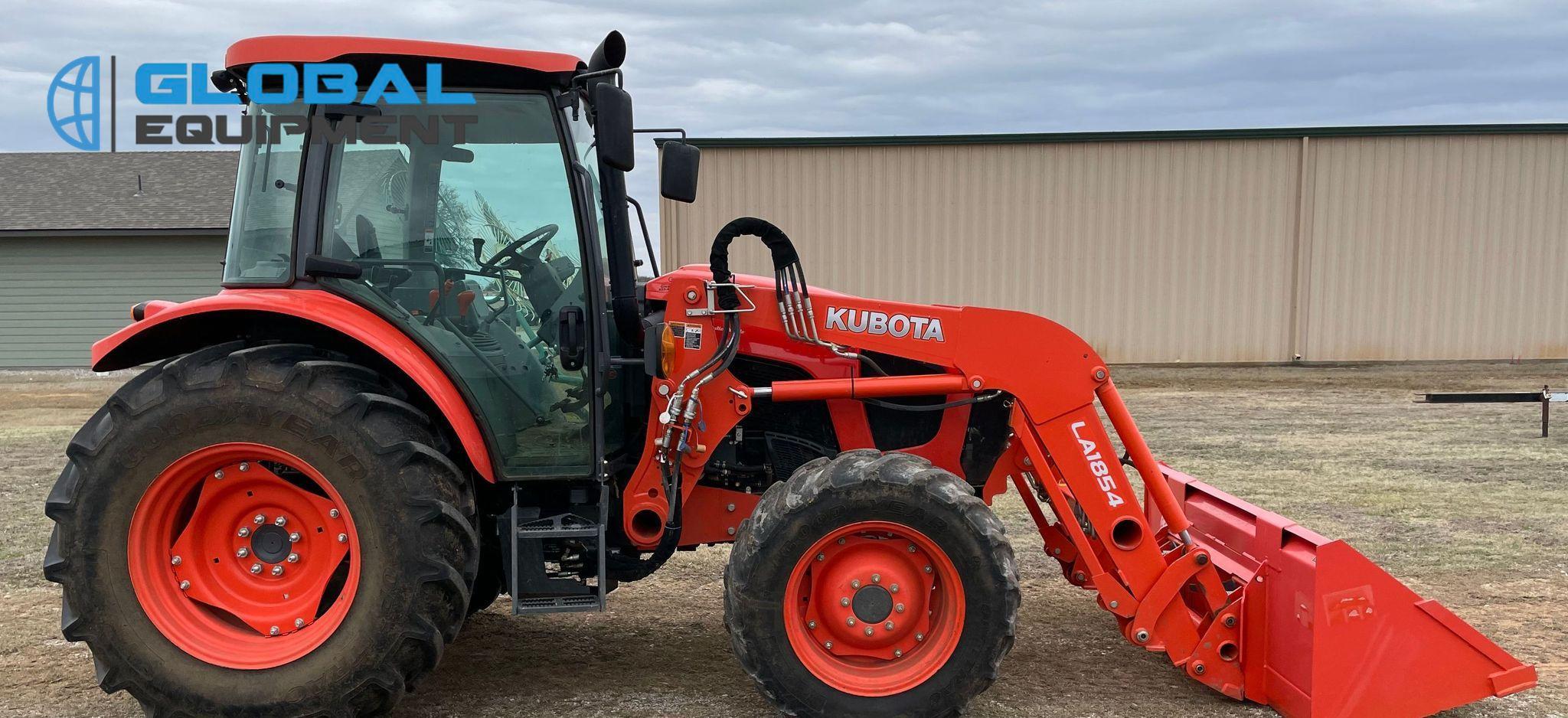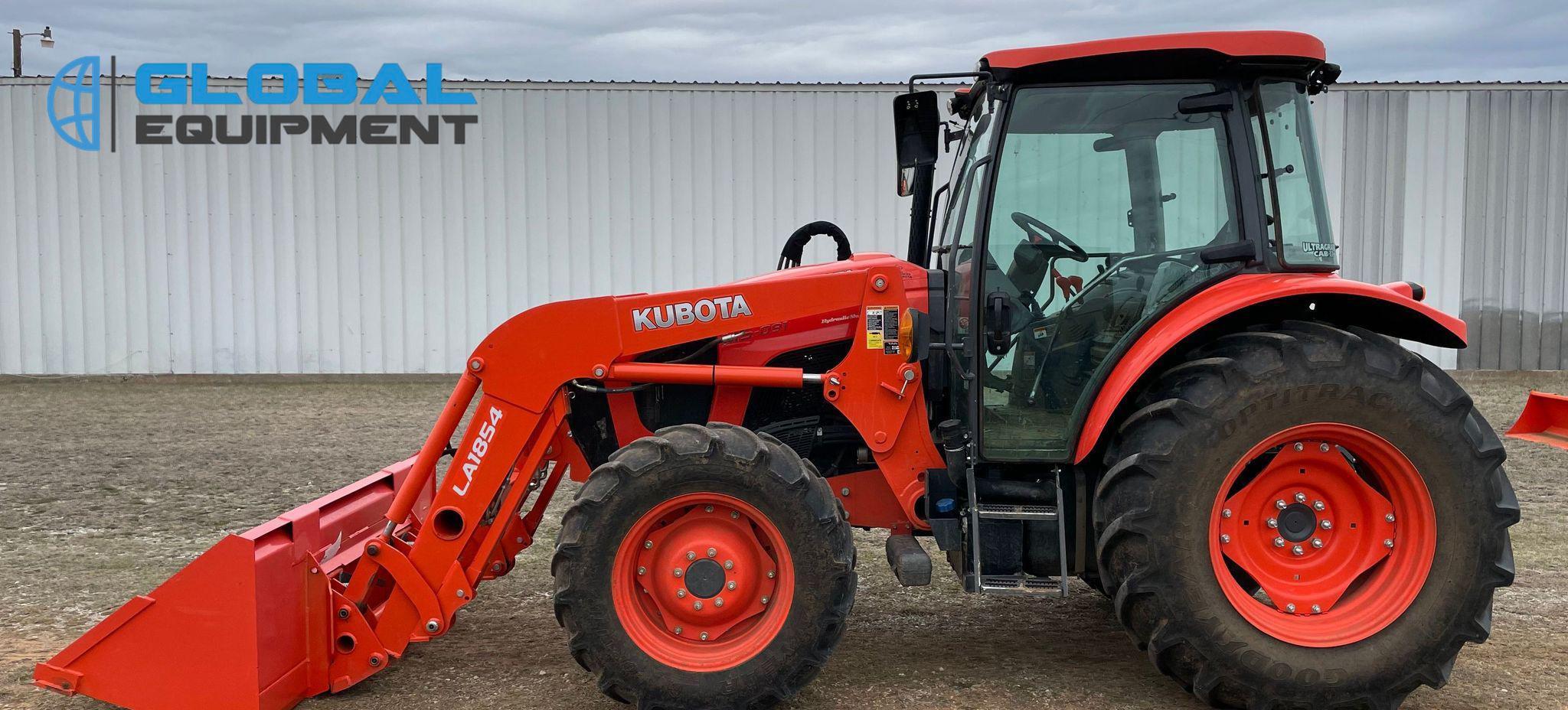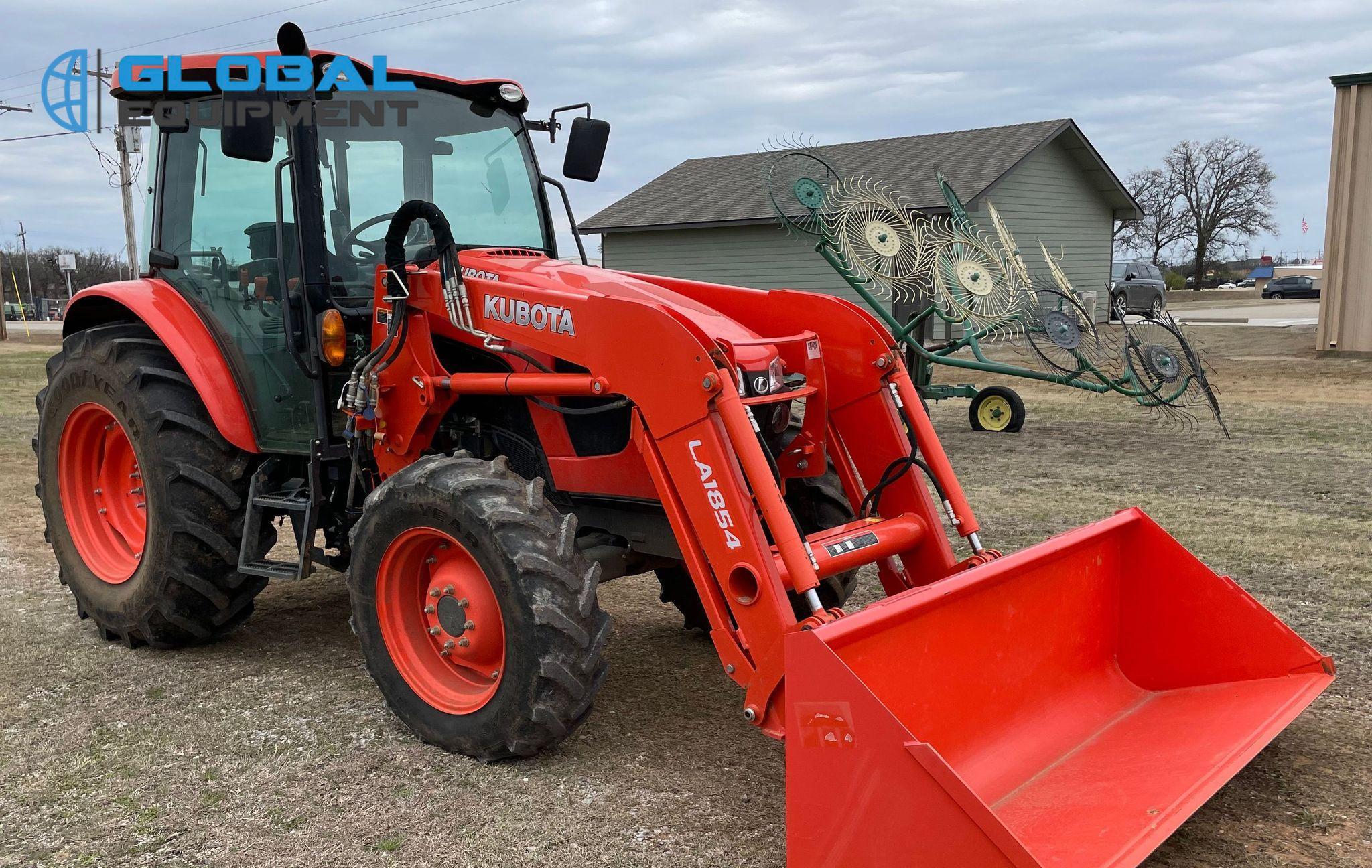 2019 Kubota M5-091D MFWD tractor, 2,040 Hours on meter, Synchro Transmission with Left-Hand Reverser and Differential Lock, Enclosed Cab with AC and Heat, Equipped with 540 PTO, Three-Point Hitch with Top Link, 2 Rear Hydraulic Remote Sets, and Kubota LA1854 Loader with Joystick Controls and 82" Bucket. Riding on Front 12.4-24 and Rear 18.4-34 Tires.