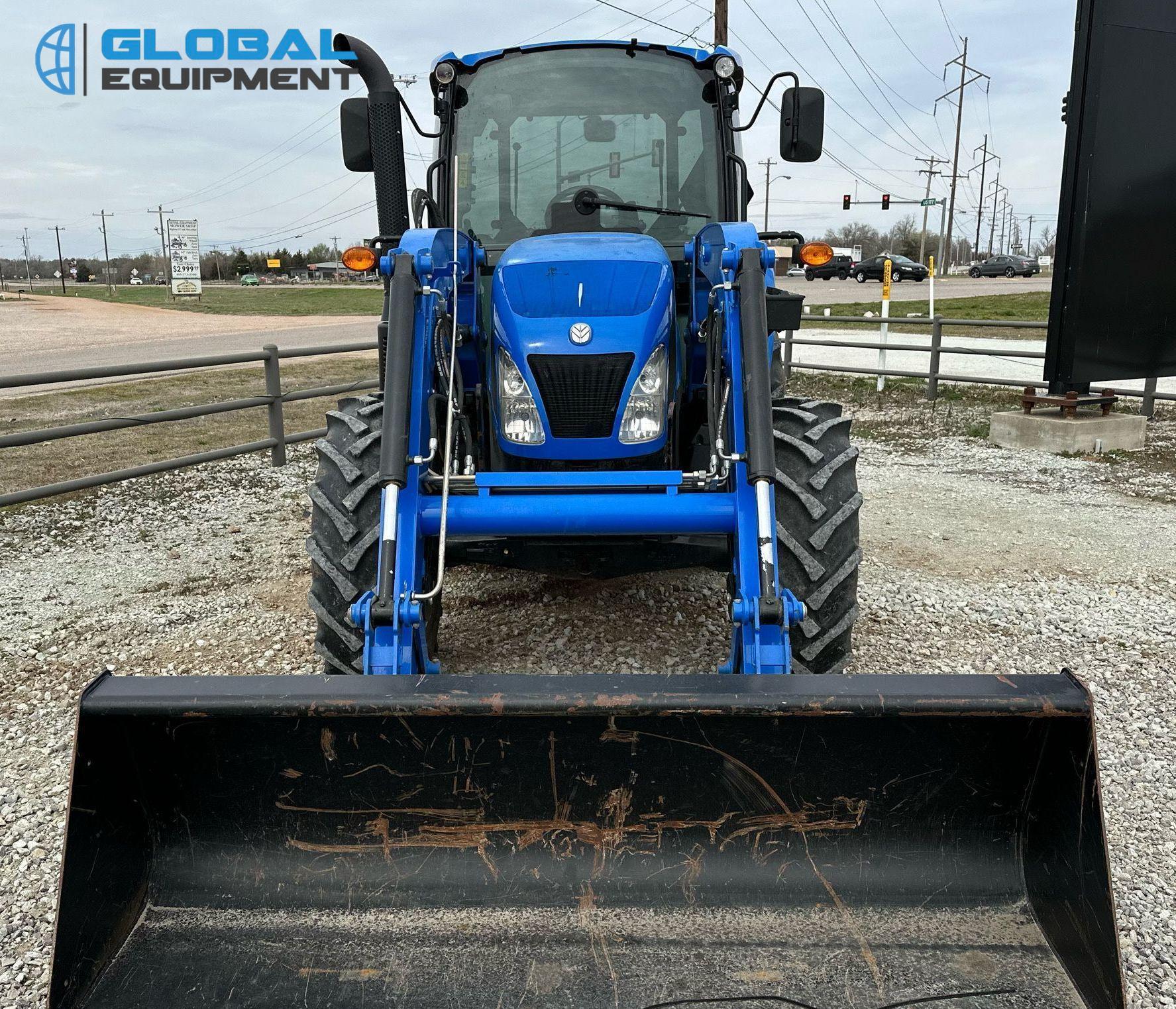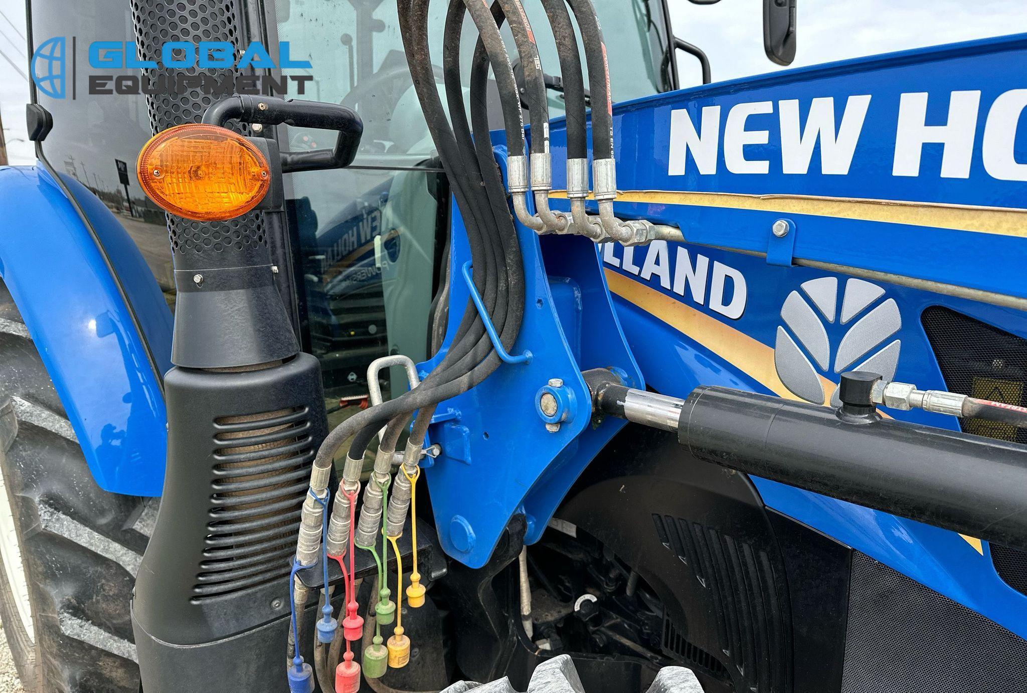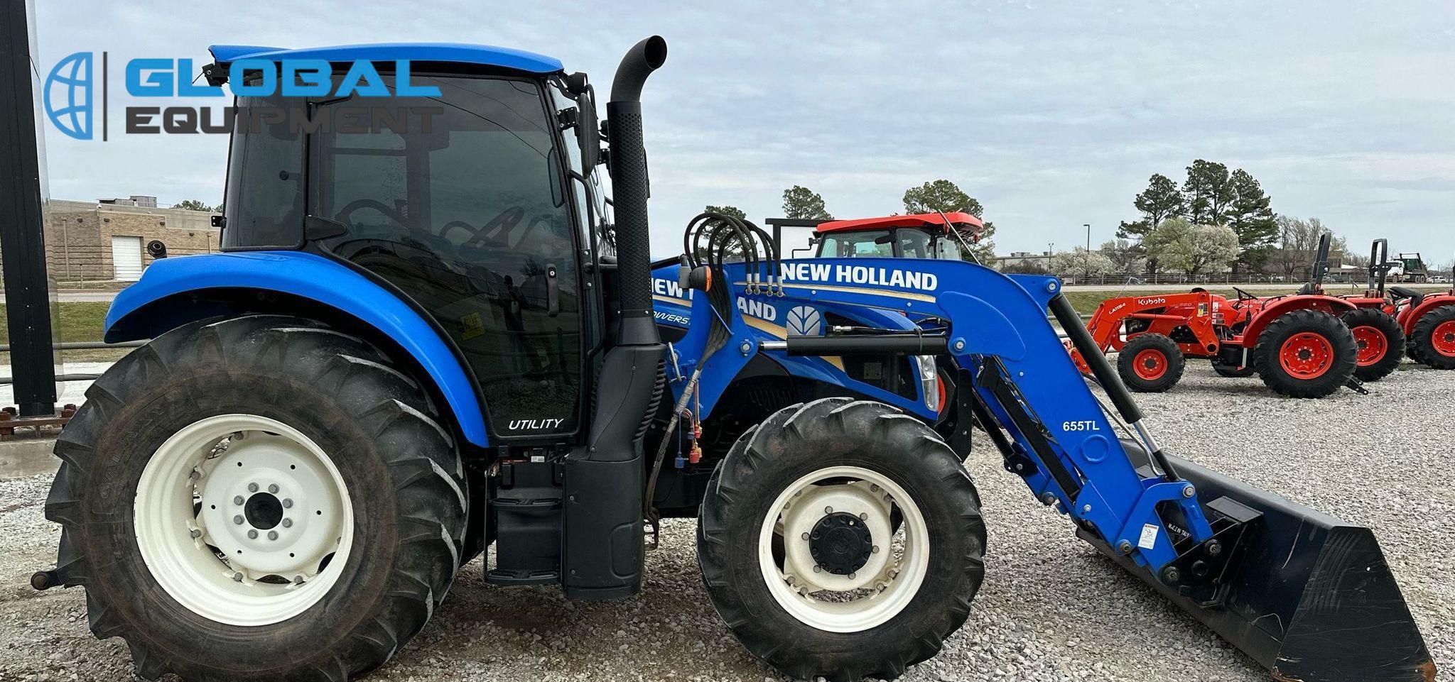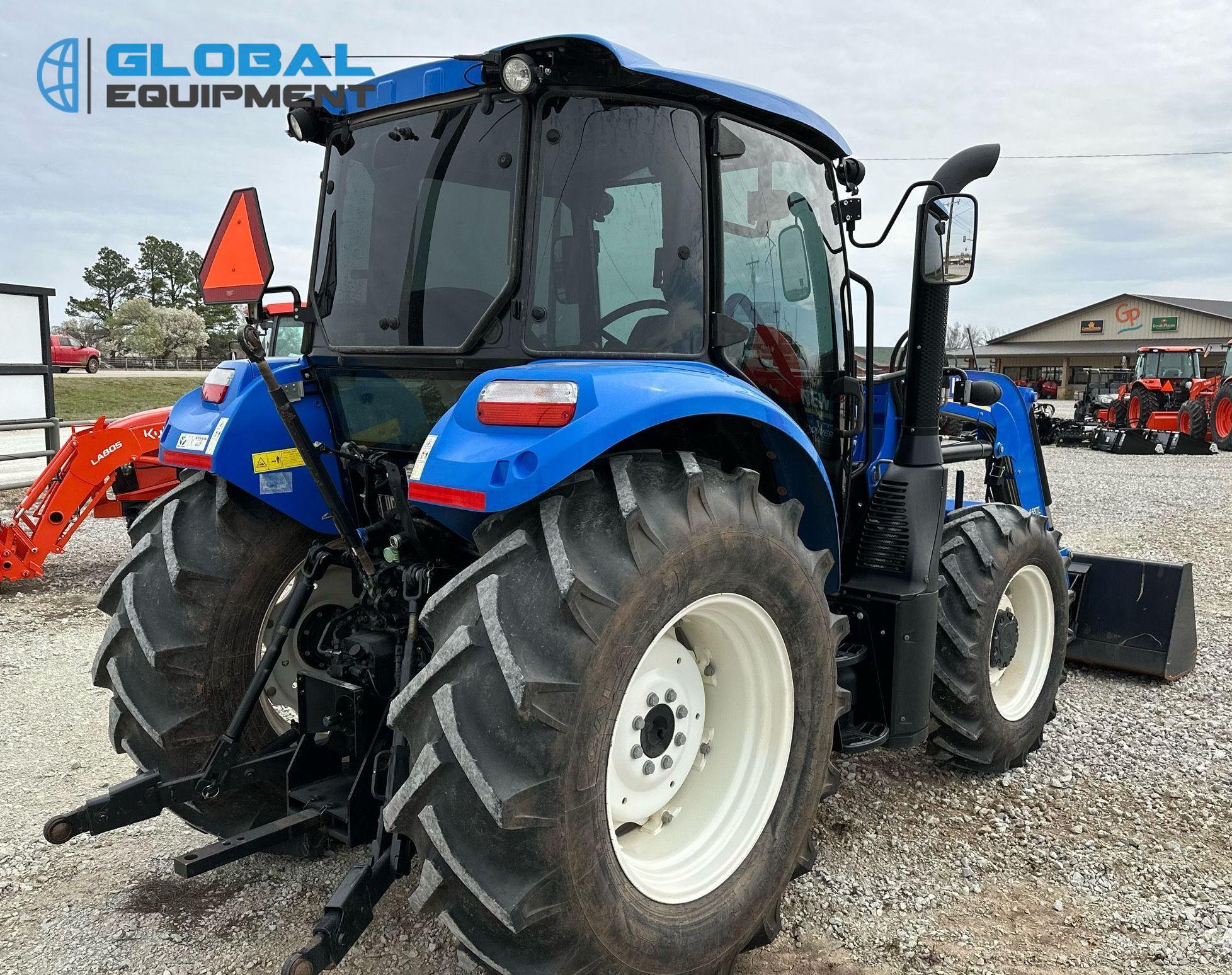 2019 New Holland Powerstar 110 MFWD tractor, 460 Hours on meter, Synchro Transmission (12F - 12R) with Differential Lock, Enclosed Cab with AC and Heat, Equipped with 540 PTO, Three-Point Hitch with Top Link, 7-Pin Outlet, 2 Rear Hydraulic Remote Sets, and New Holland 655TL Loader with Joystick Controls and 84" Bucket. Riding on Front 12.4-24 and Rear 18.4-30 Tires.