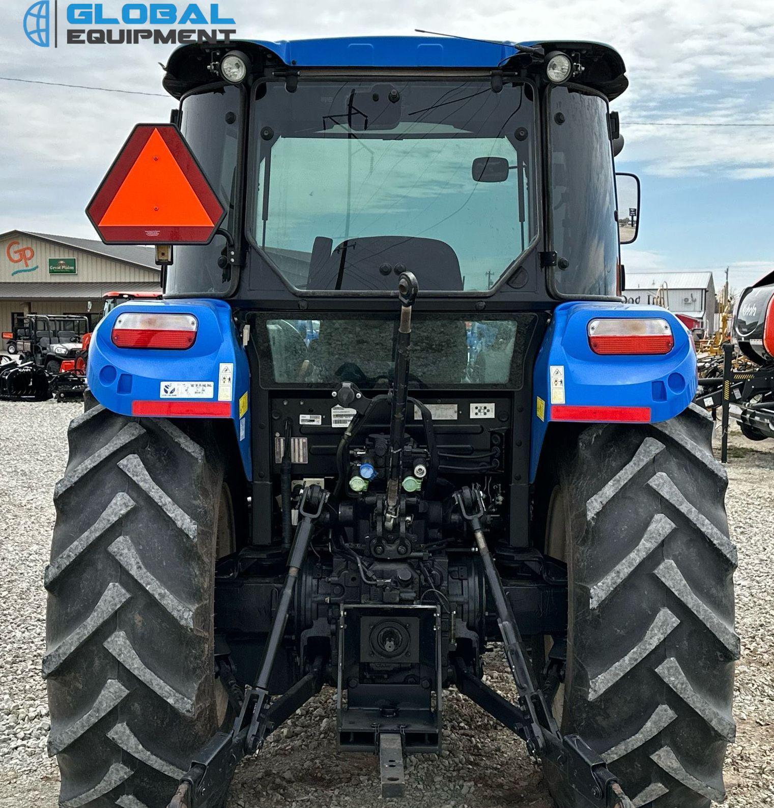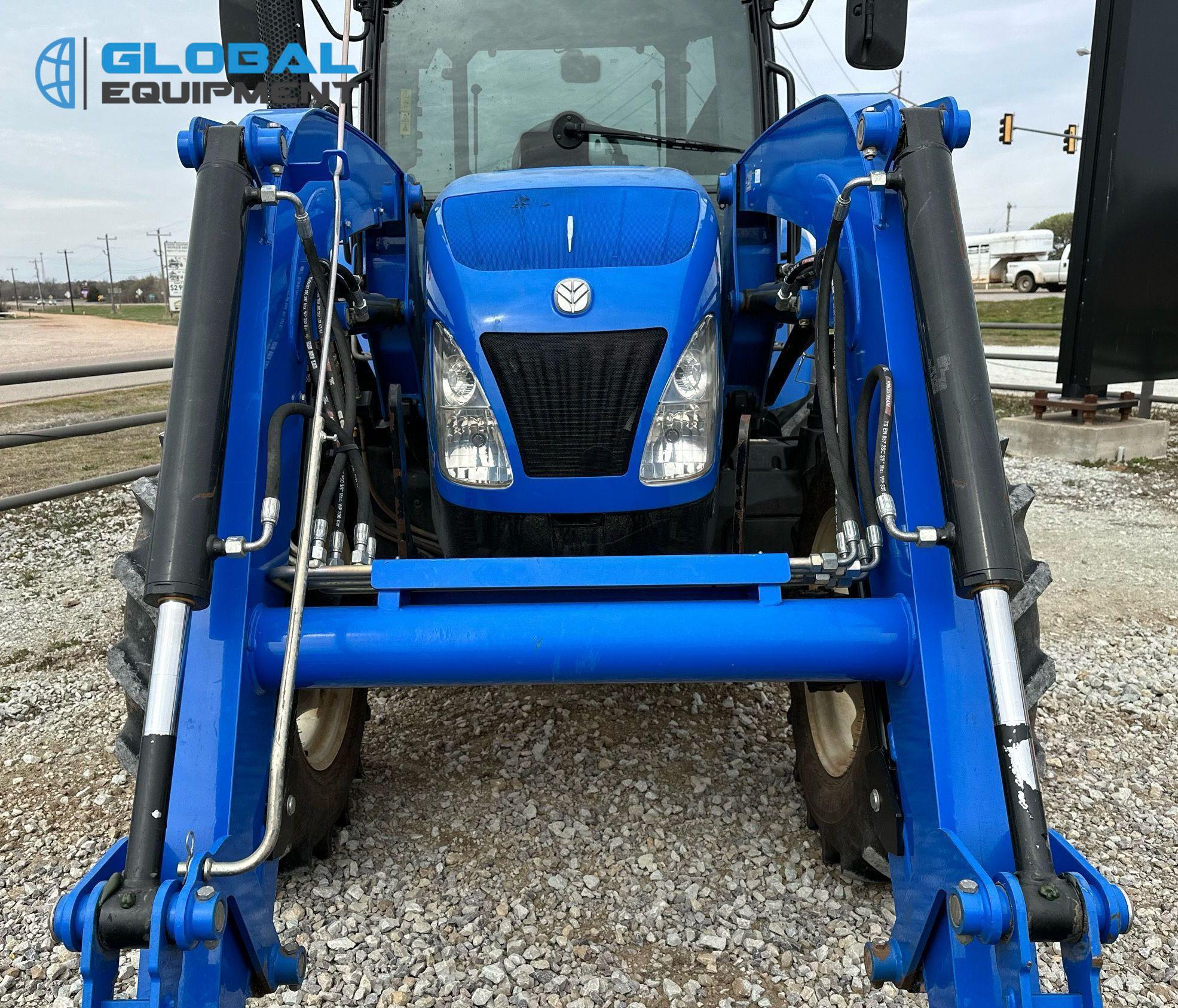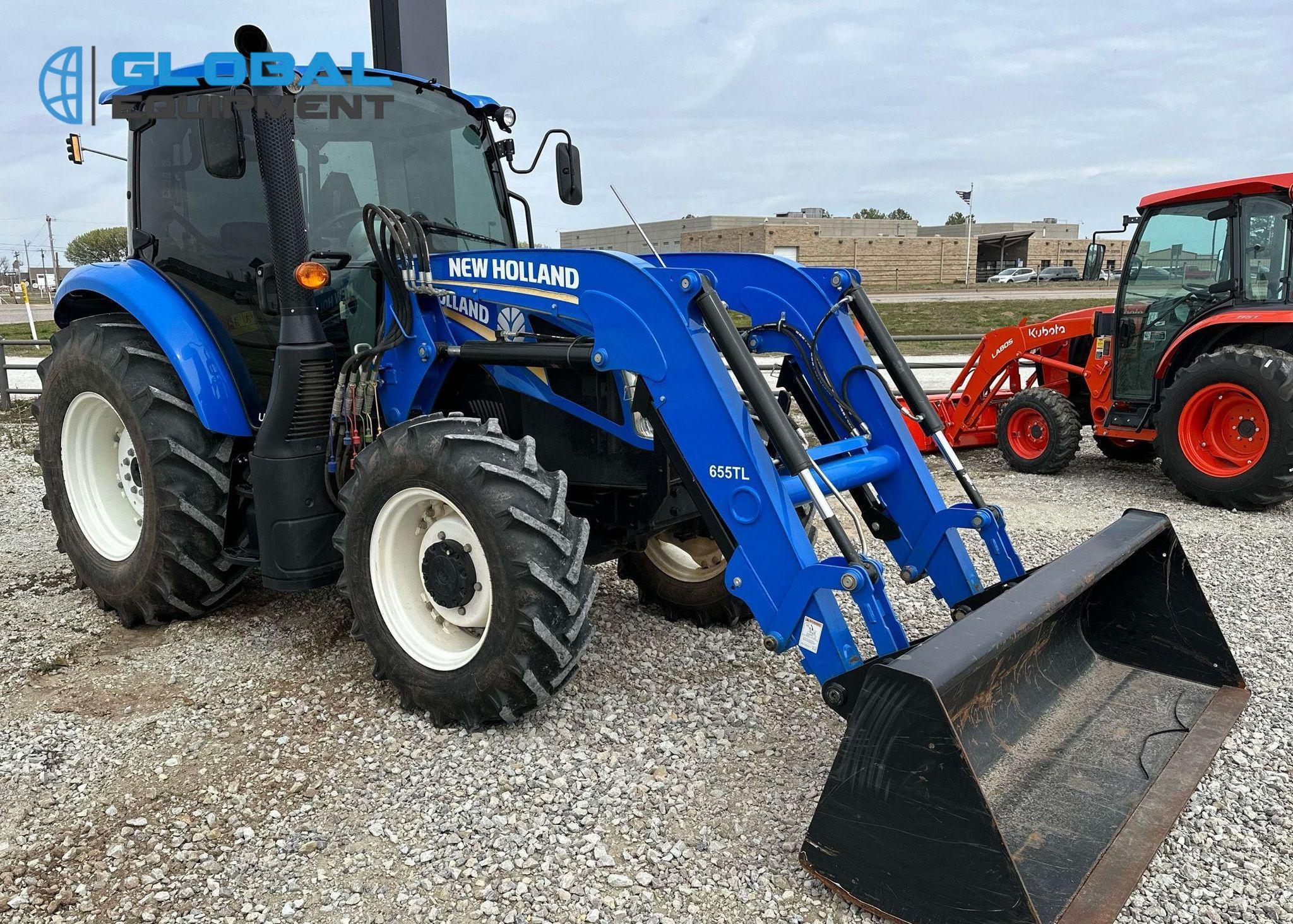 2019 New Holland Powerstar 110 MFWD tractor, 460 Hours on meter, Synchro Transmission (12F - 12R) with Differential Lock, Enclosed Cab with AC and Heat, Equipped with 540 PTO, Three-Point Hitch with Top Link, 7-Pin Outlet, 2 Rear Hydraulic Remote Sets, and New Holland 655TL Loader with Joystick Controls and 84" Bucket. Riding on Front 12.4-24 and Rear 18.4-30 Tires.