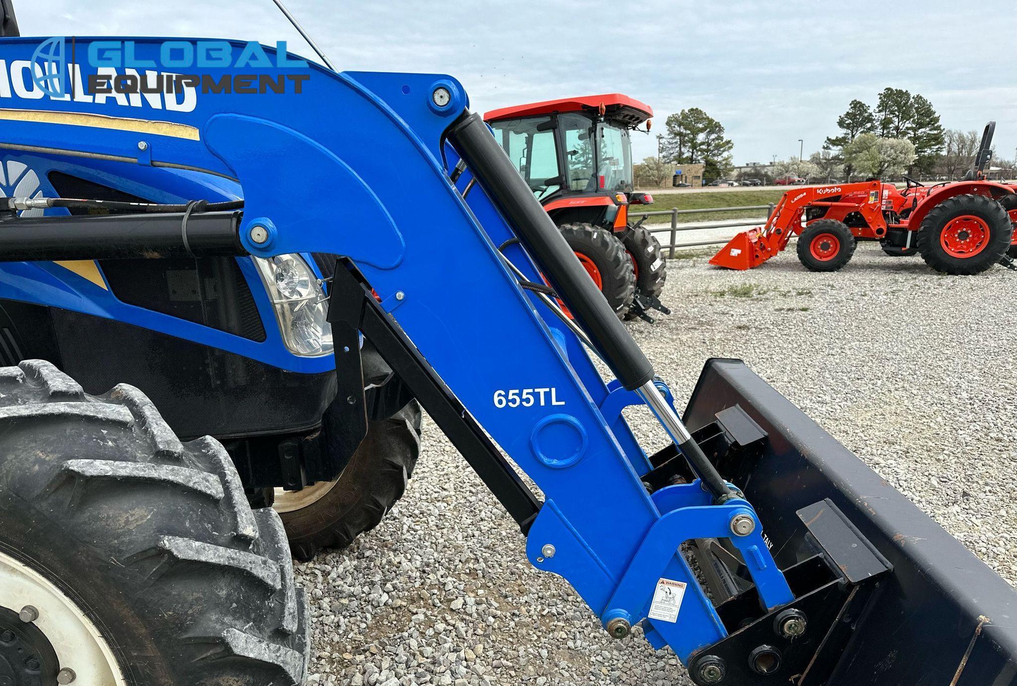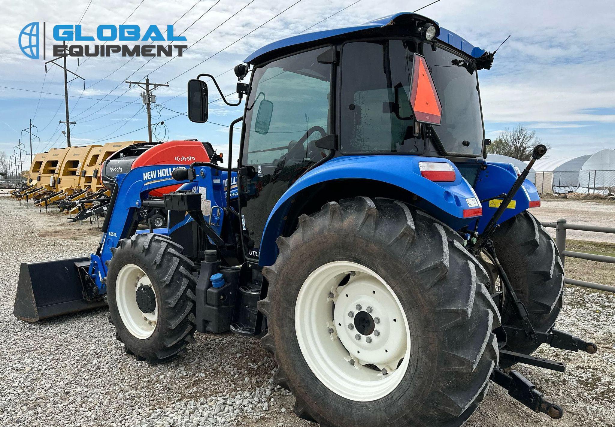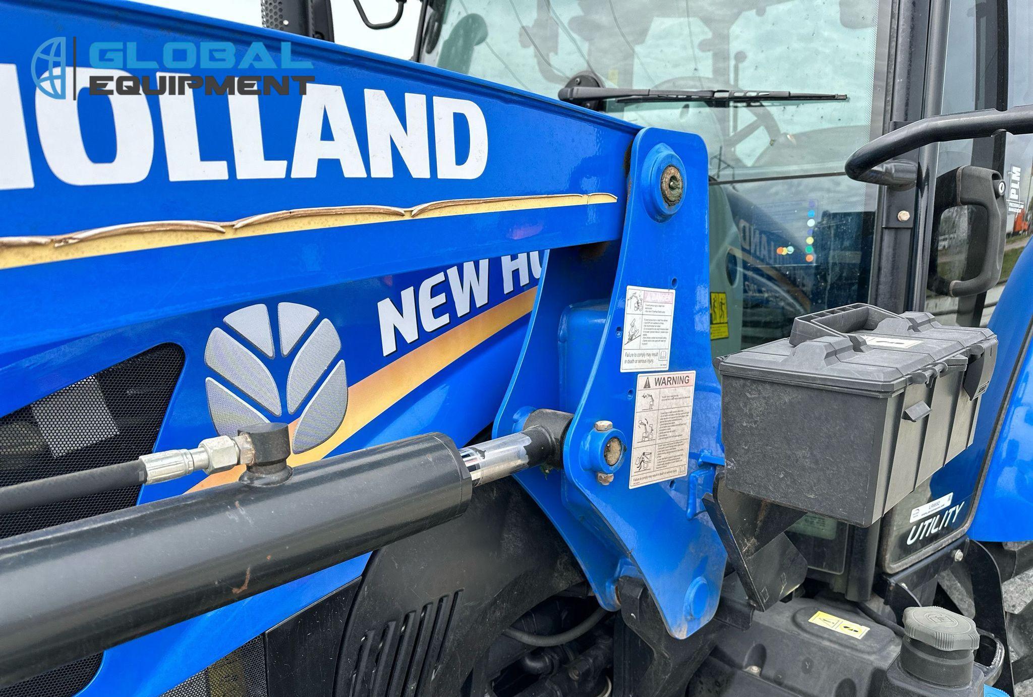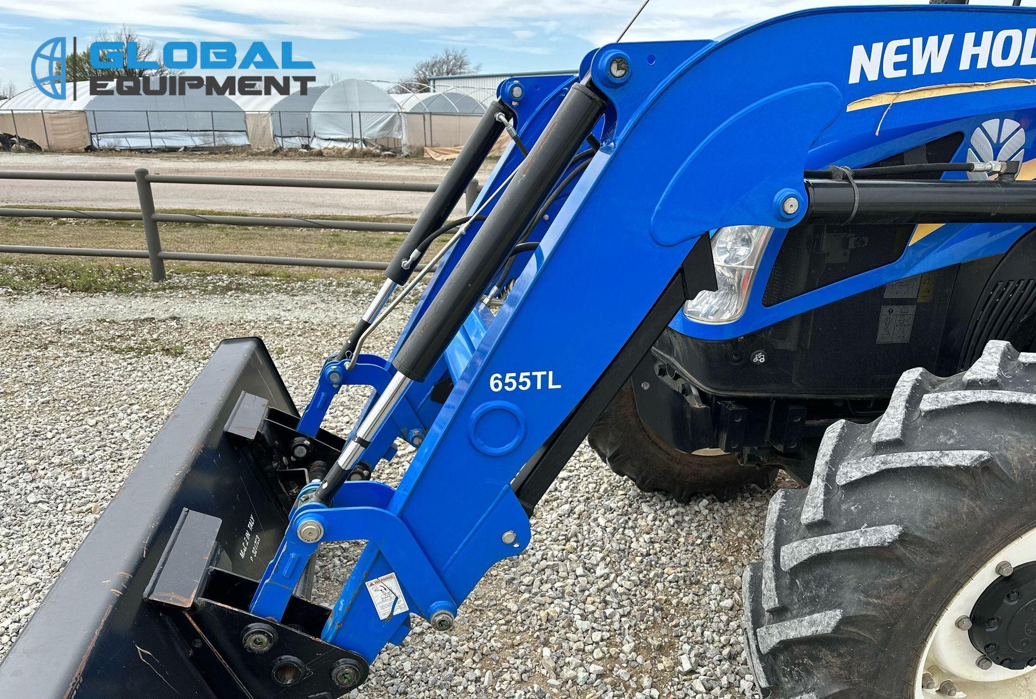 2019 New Holland Powerstar 110 MFWD tractor, 460 Hours on meter, Synchro Transmission (12F - 12R) with Differential Lock, Enclosed Cab with AC and Heat, Equipped with 540 PTO, Three-Point Hitch with Top Link, 7-Pin Outlet, 2 Rear Hydraulic Remote Sets, and New Holland 655TL Loader with Joystick Controls and 84" Bucket. Riding on Front 12.4-24 and Rear 18.4-30 Tires.