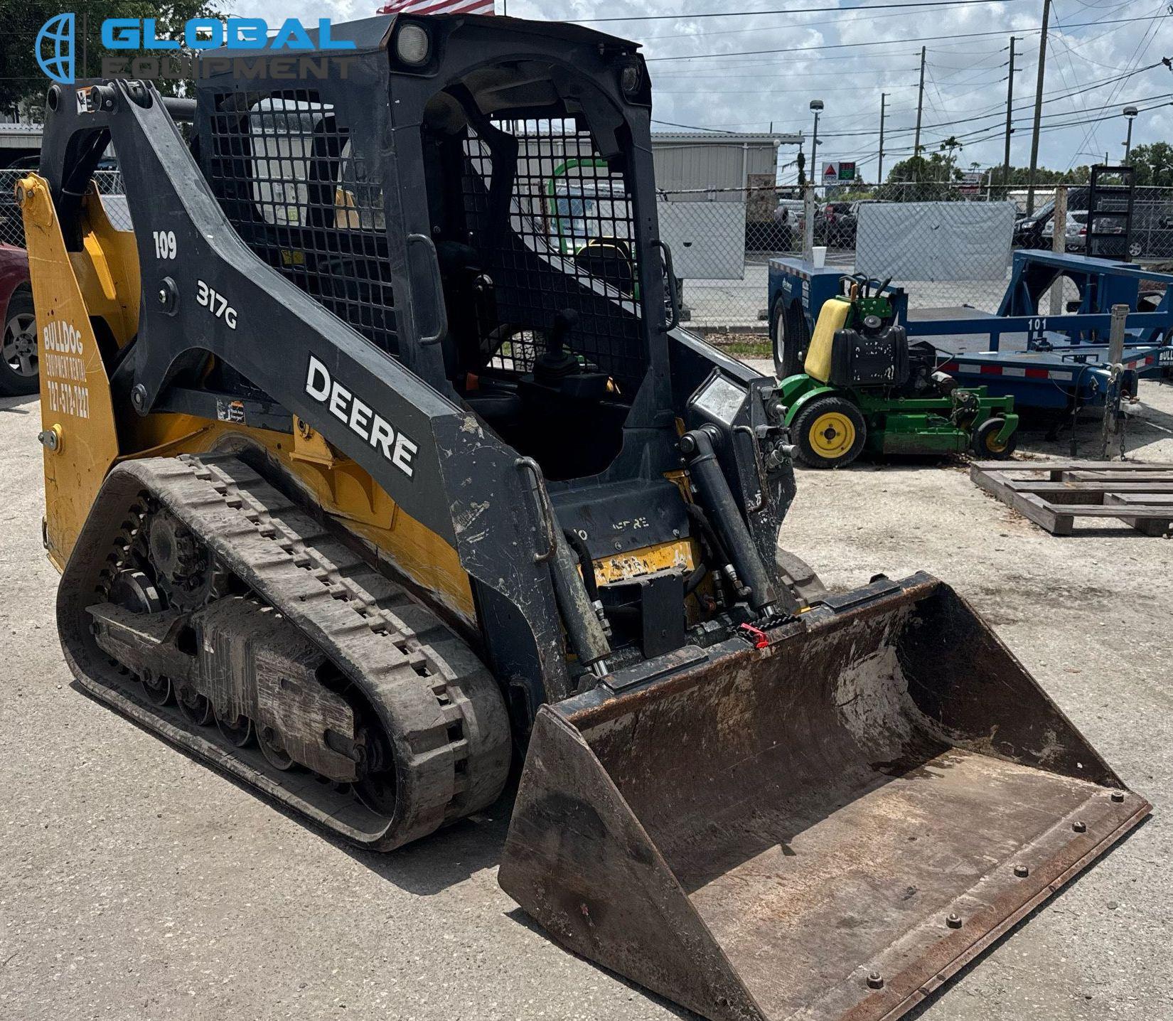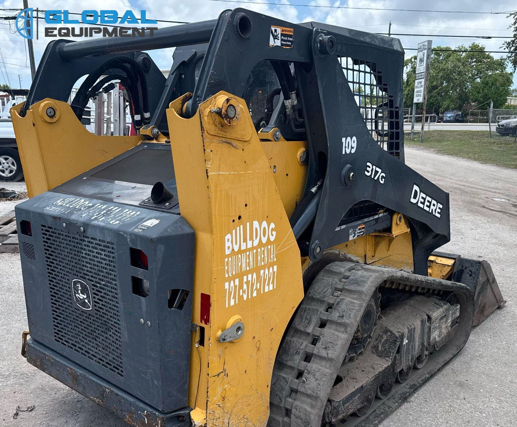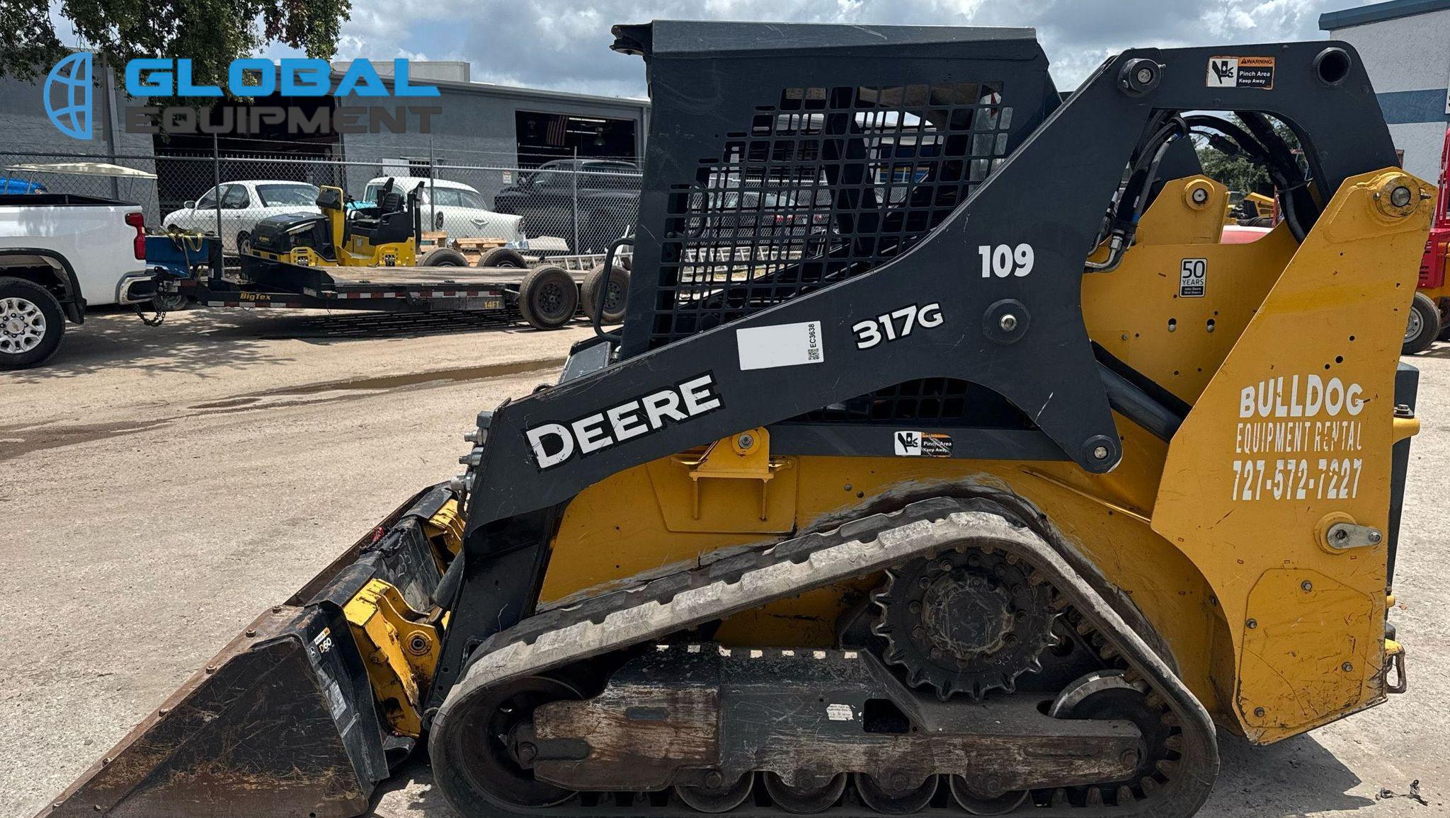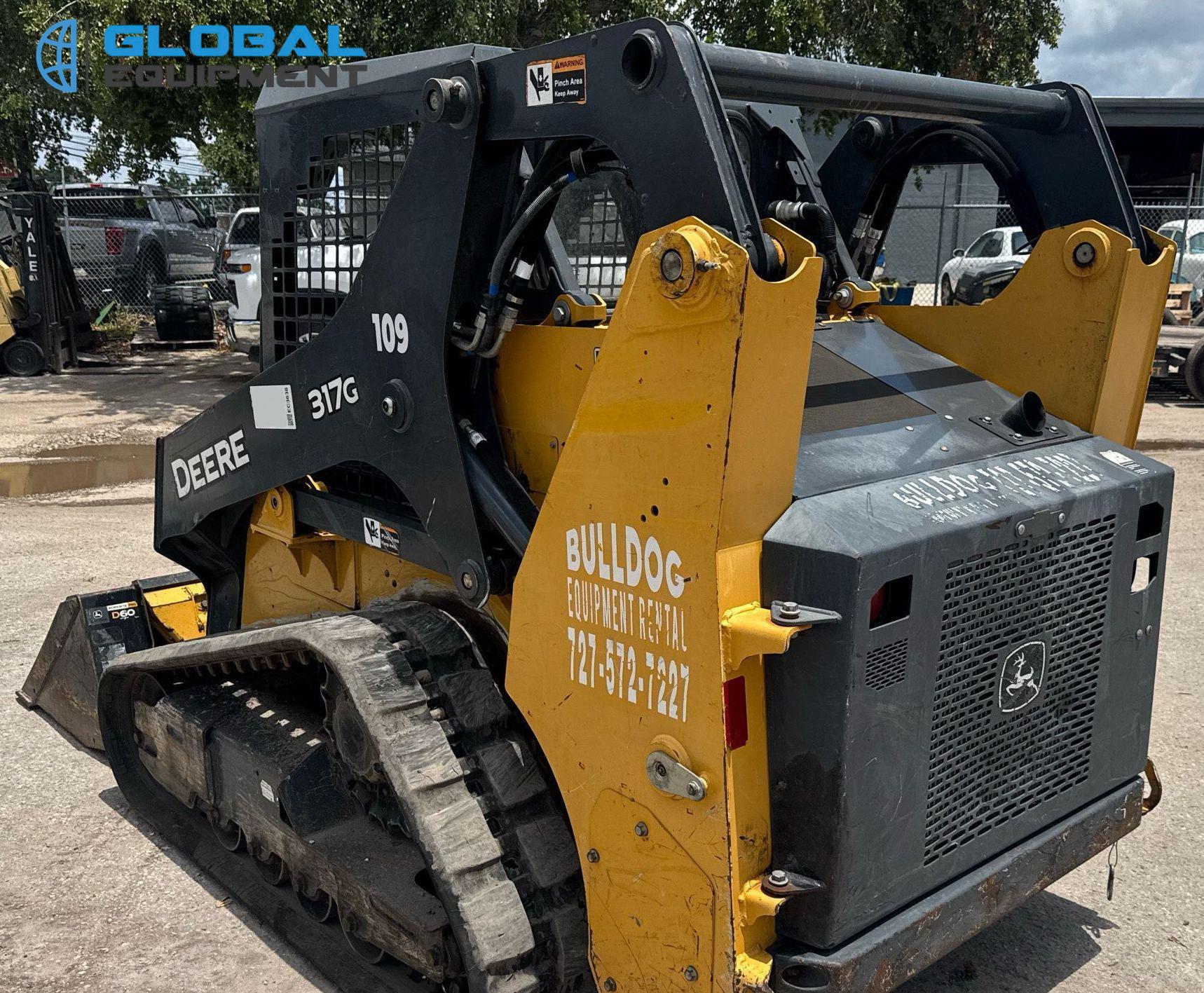 2020 John Deere 317G tracked skid steer loader, 1,875 Hours on meter, Hydrostatic Transmission with Two-Speed Travel, OROPS, Yanmar 4RHMAC 2.091L 4-Cylinder Diesel Engine, Manual Quick Coupler, Auxiliary Hydraulics & Electrical Outlet, Equipped with John Deere 60" Bucket (Bolt-on Cutting Edge), and 12.5" Wide Tracks.