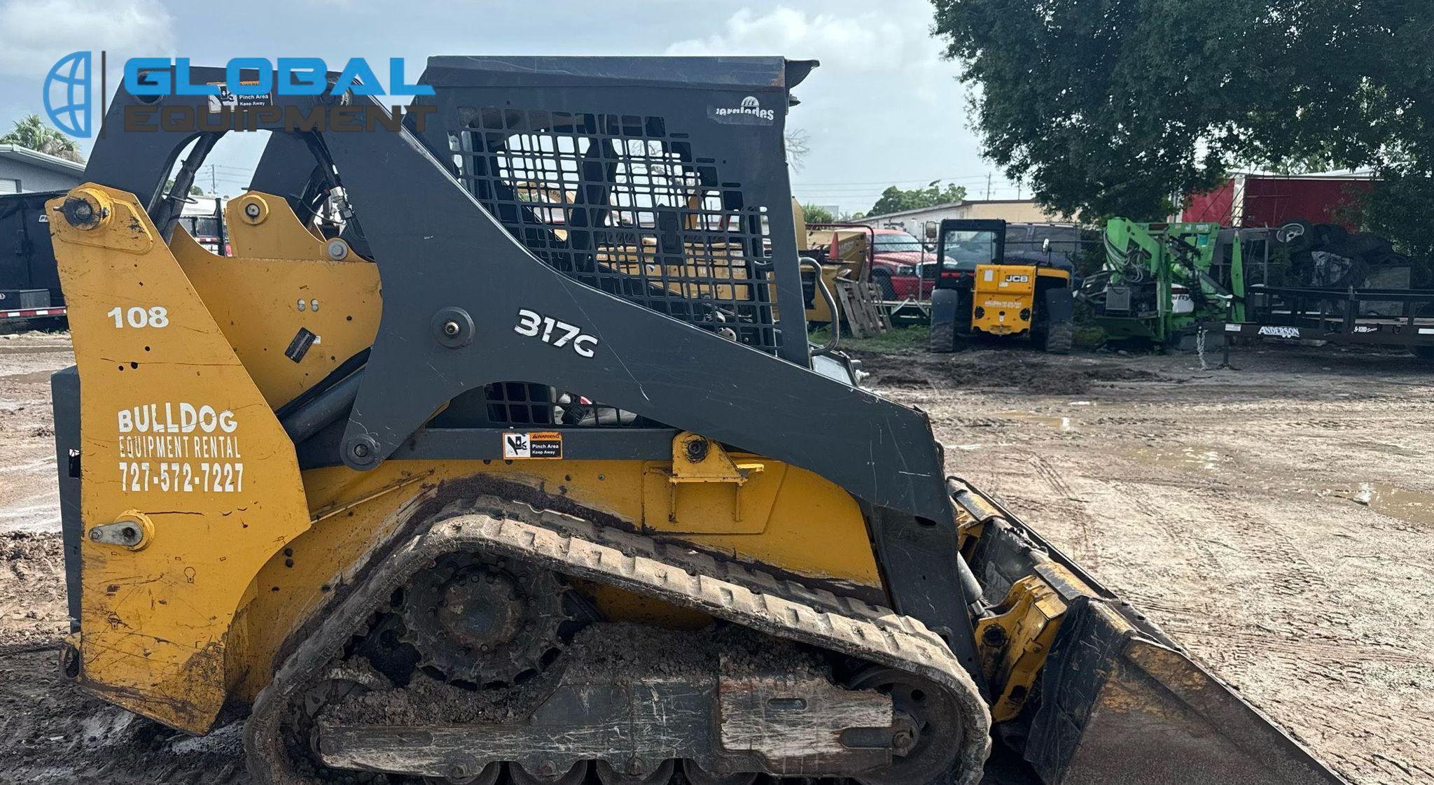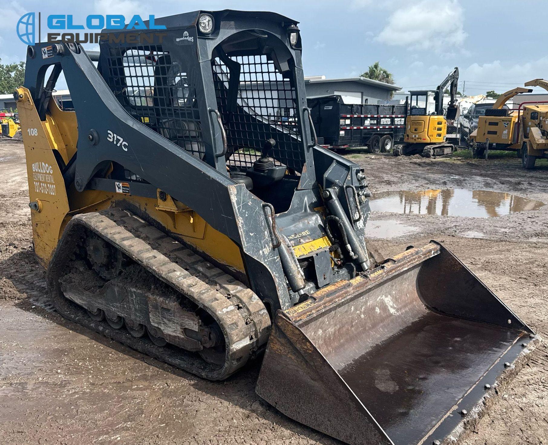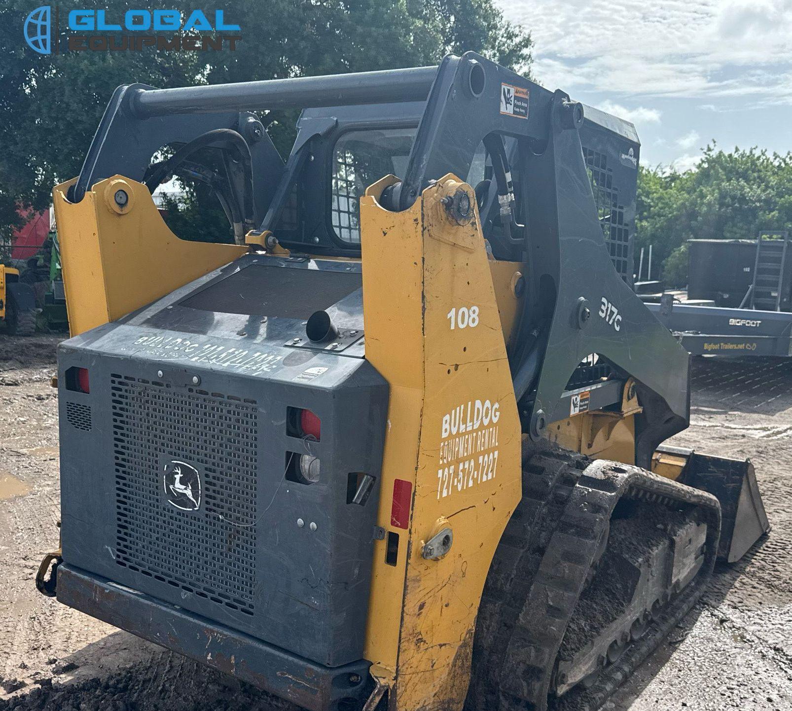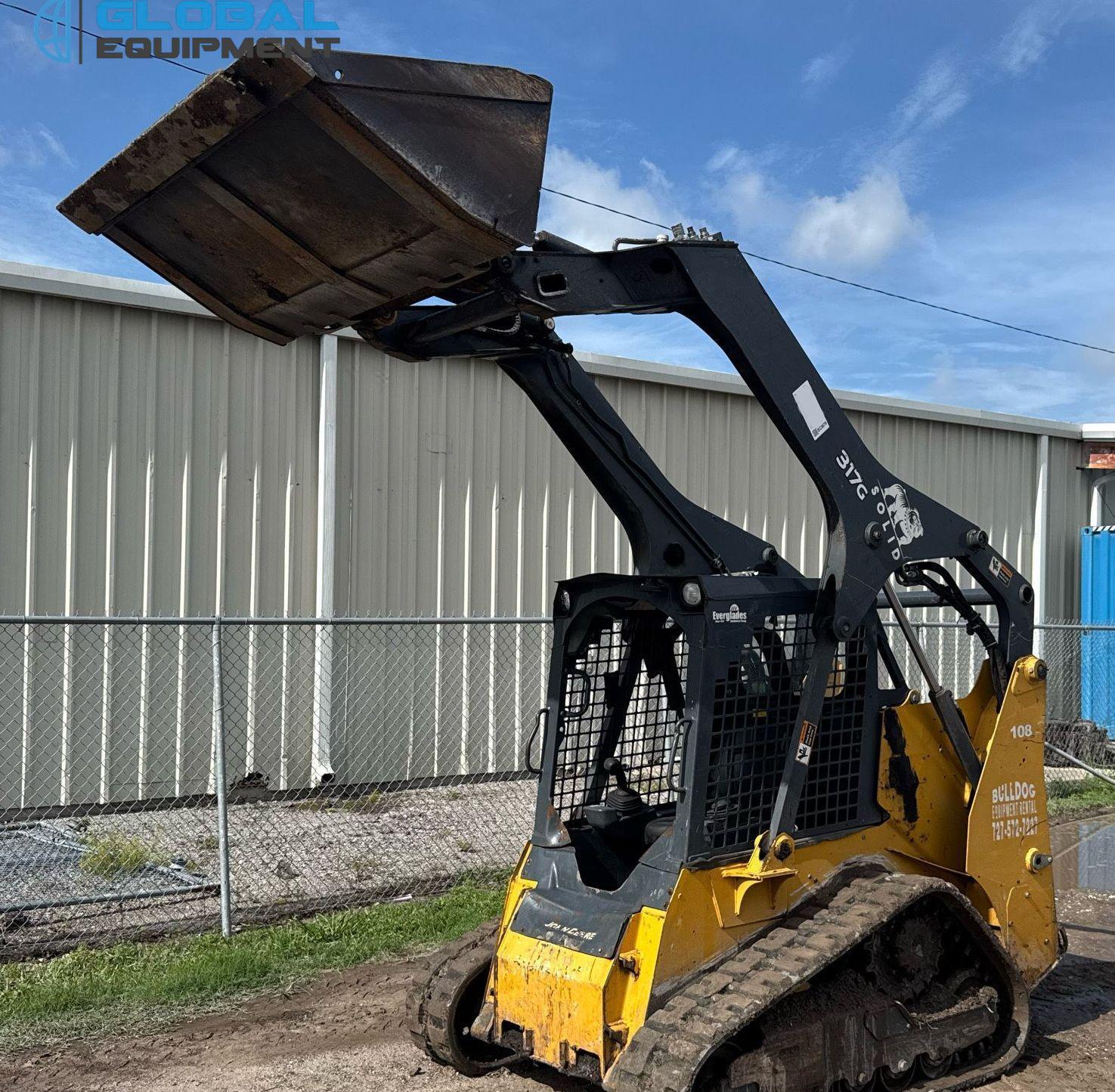 2020 John Deere 317G tracked skid steer loader, 2,034 Hours on meter, Hydrostatic Transmission with Two-Speed Travel, Yanmar 4RHMAC 2.091L 4-Cylinder Diesel Engine, Manual Quick Coupler, Auxiliary Hydraulics & Electrical Outlet, Equipped with John Deere 66" Bucket (Bolt-on Cutting Edge), and 13" Wide Tracks.