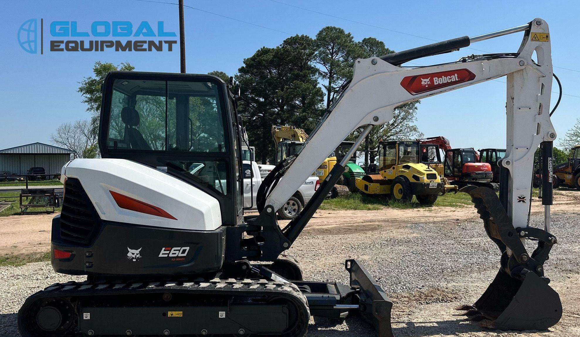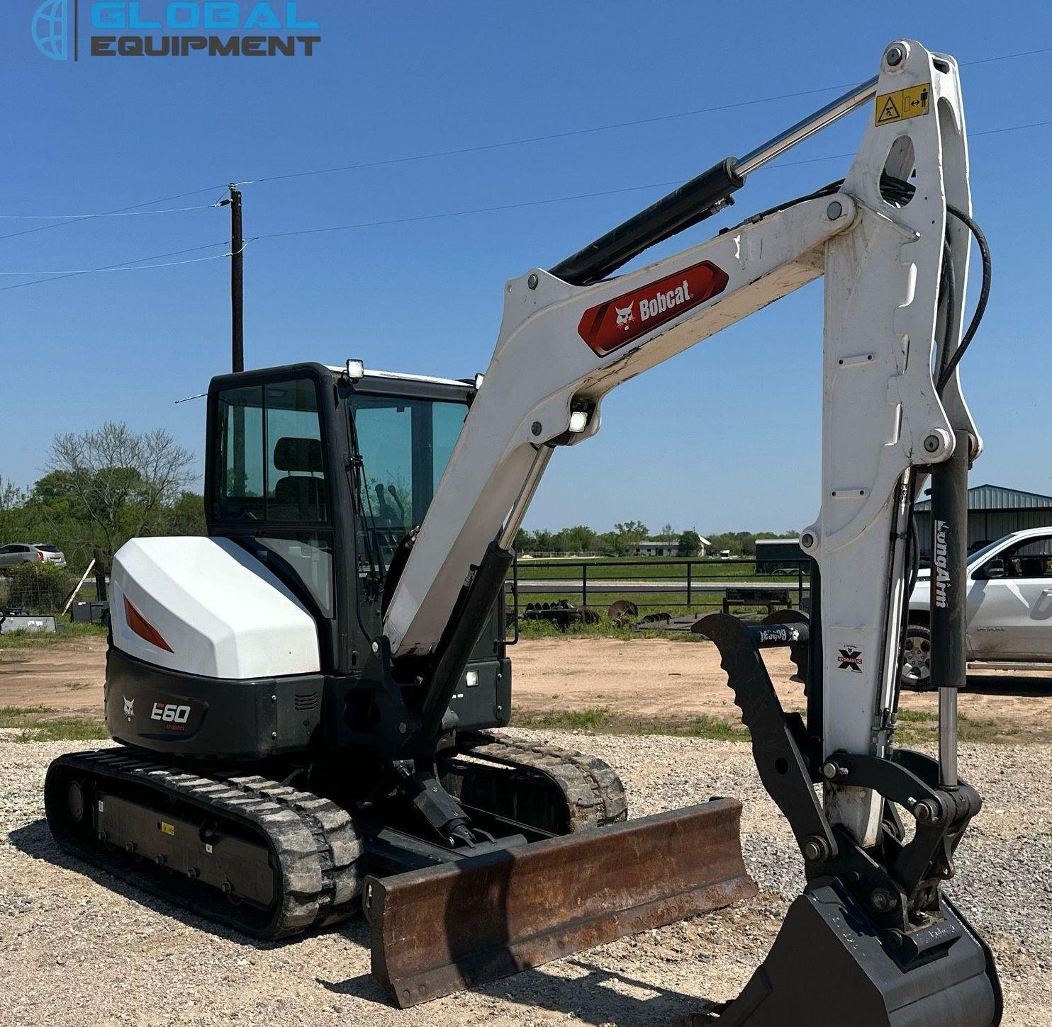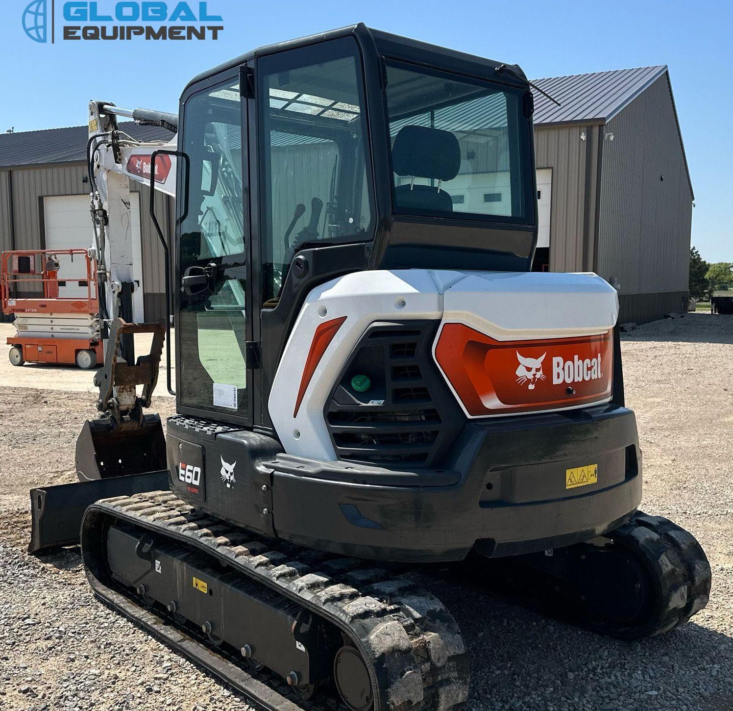 2021 Bobcat E60 mini excavator, 343 Hours on meter, Hydrostatic Transmission, Enclosed Cab with AC/Heat and Pattern Changer, Bobcat MDICL02.4LEA 2.4L 4-Cylinder Diesel Engine (19 kW), Hydraulic Quick Coupler, Auxiliary Two-Way Hydraulics, Backfill Blade (78"), Swing Boom, 75" Stick with Hydraulic Thumb, Equipped with 24" Bobcat Bucket (4 Teeth), and 16" Rubber Tracks.