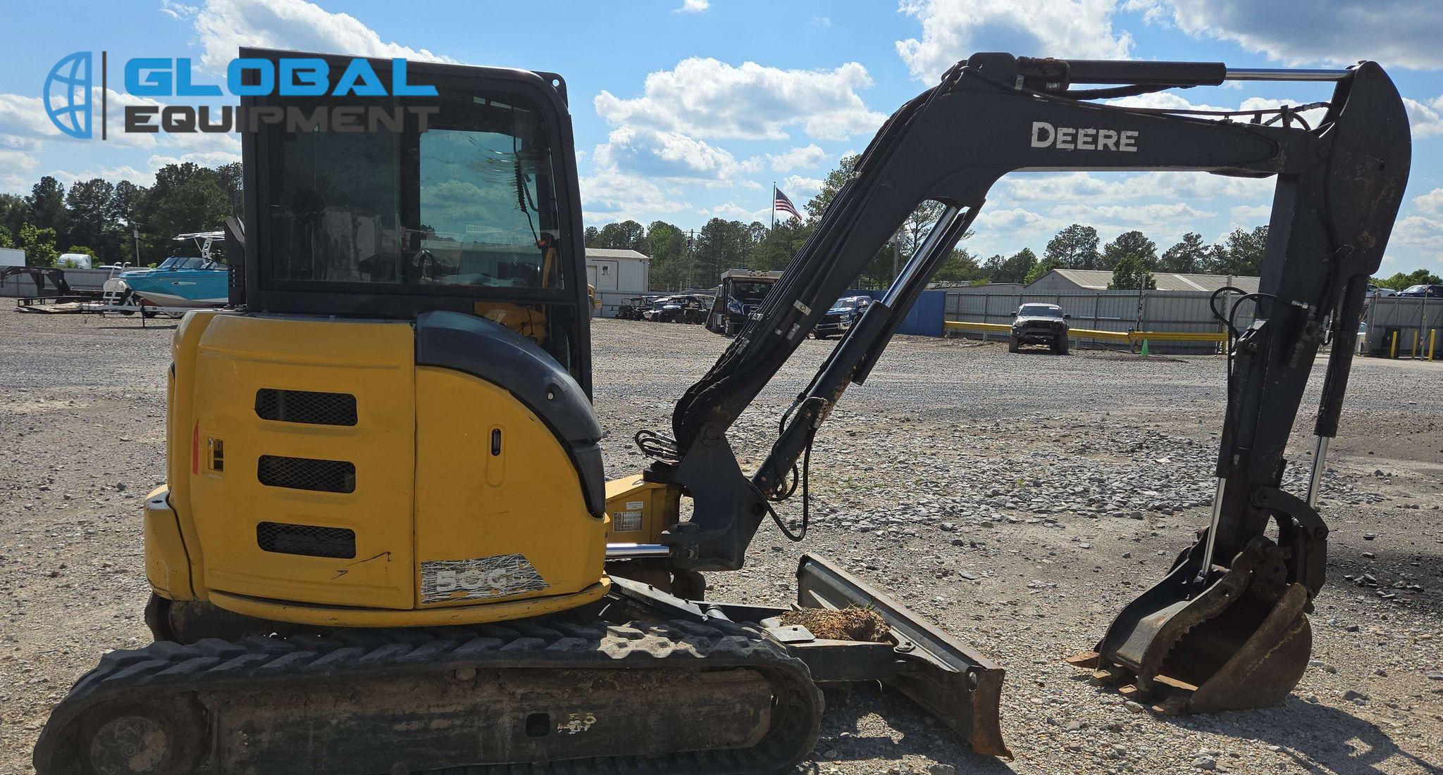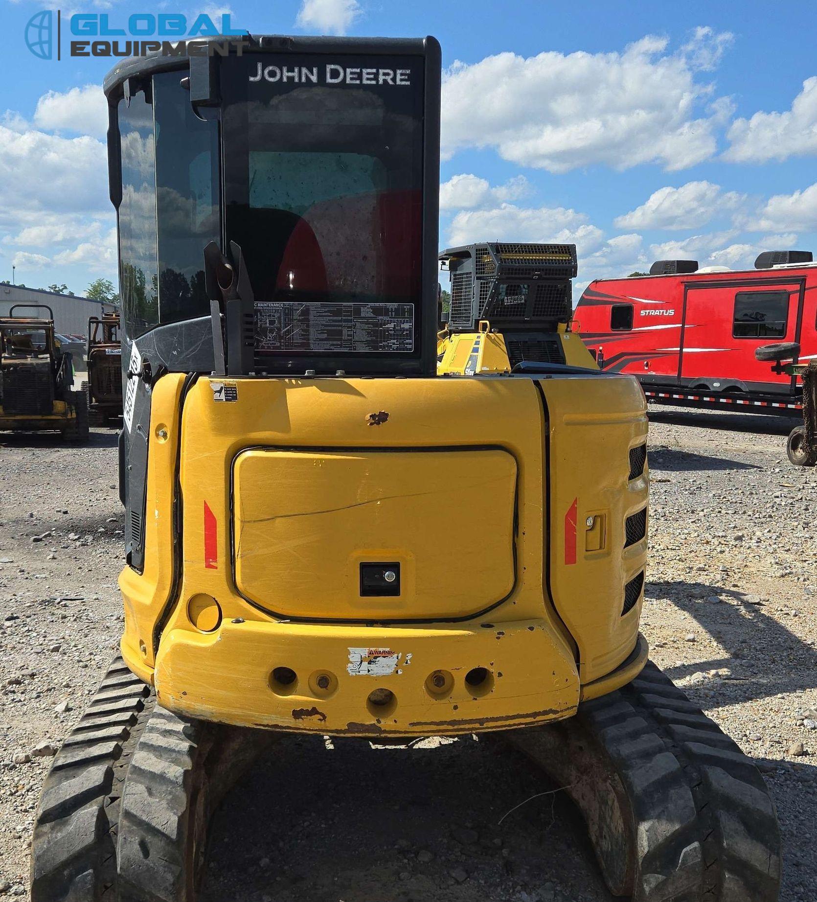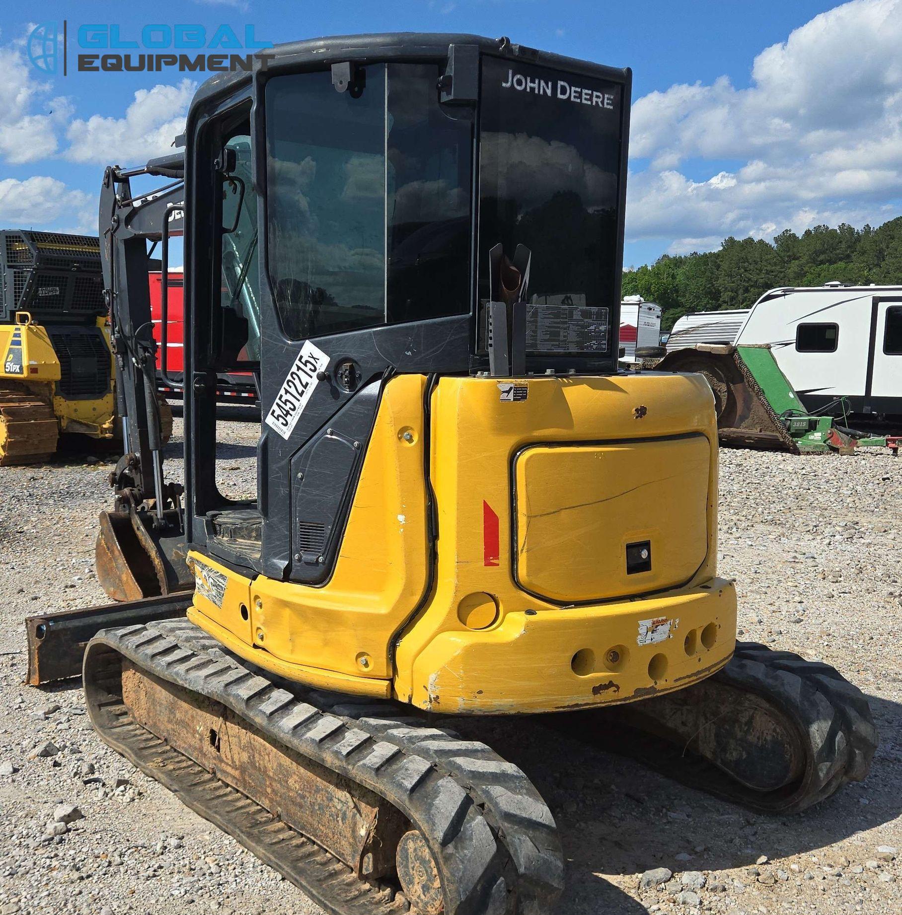 2022 John Deere 50G mini excavator, 2,608 Hours on meter, Hydrostatic Transmission with Two-Speed Travel, Enclosed Cab with AC/Heat, Yanmar 4TNV88C 2.19L 4-Cylinder Diesel Engine, Equipped with Auxiliary Hydraulics, Backfill Blade (78"), Swing Boom, 5' 6" Stick with Hydraulic Thumb, 24" Bucket (4 Teeth), and 15" Rubber Tracks. Note: Door and Window Missing, Non-operational Quick Coupler.