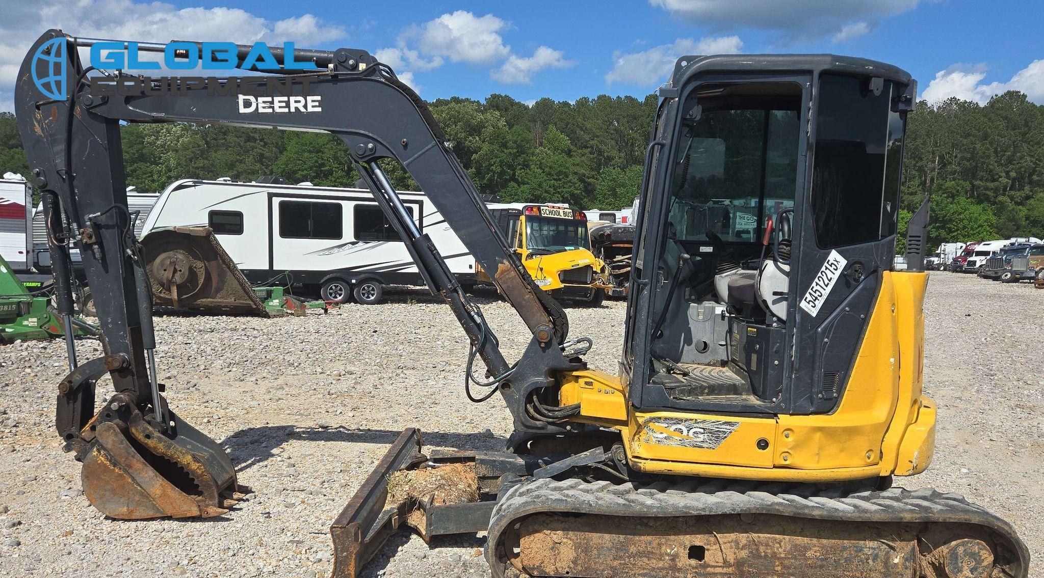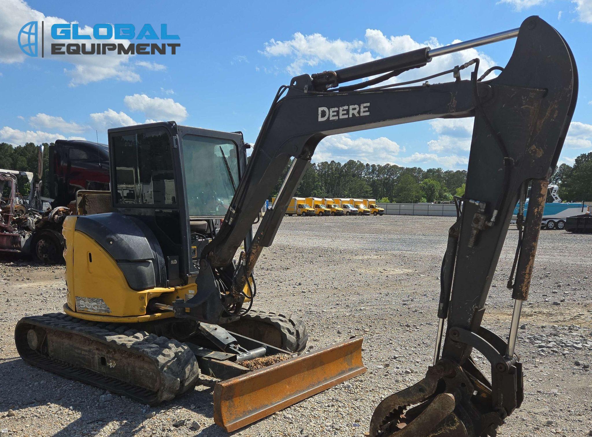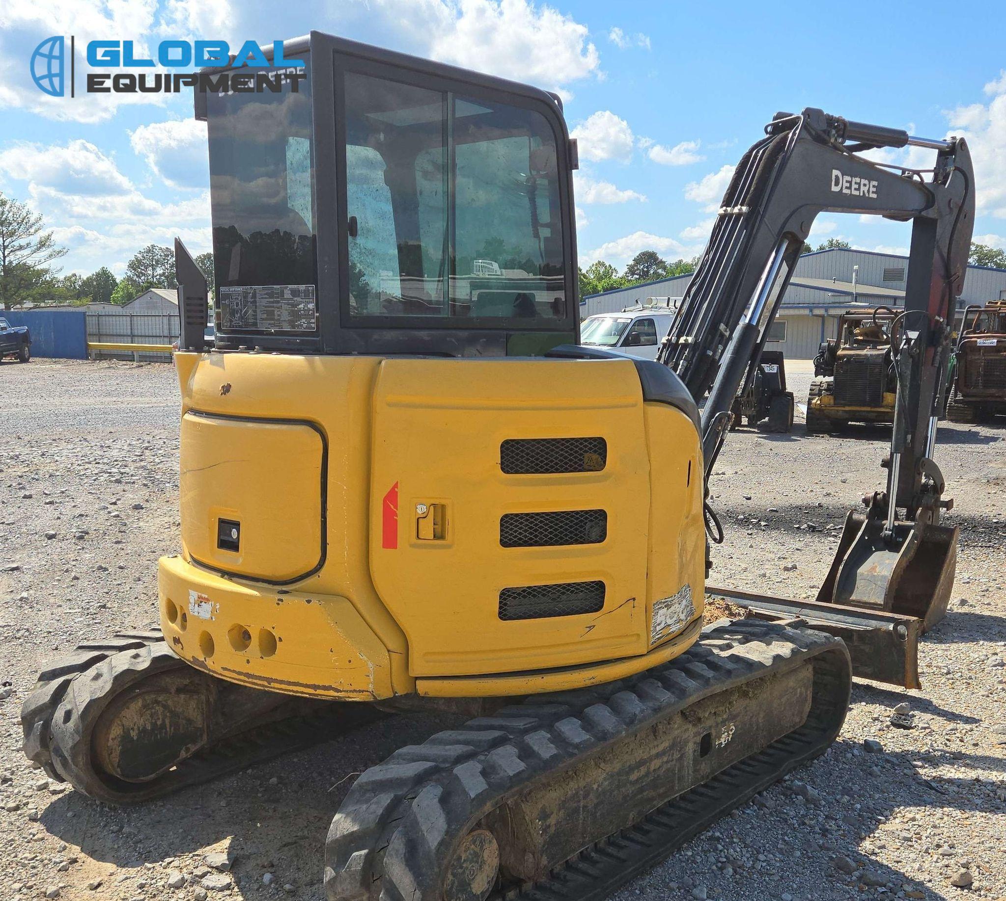 2022 John Deere 50G mini excavator, 2,608 Hours on meter, Hydrostatic Transmission with Two-Speed Travel, Enclosed Cab with AC/Heat, Yanmar 4TNV88C 2.19L 4-Cylinder Diesel Engine, Equipped with Auxiliary Hydraulics, Backfill Blade (78"), Swing Boom, 5' 6" Stick with Hydraulic Thumb, 24" Bucket (4 Teeth), and 15" Rubber Tracks. Note: Door and Window Missing, Non-operational Quick Coupler.