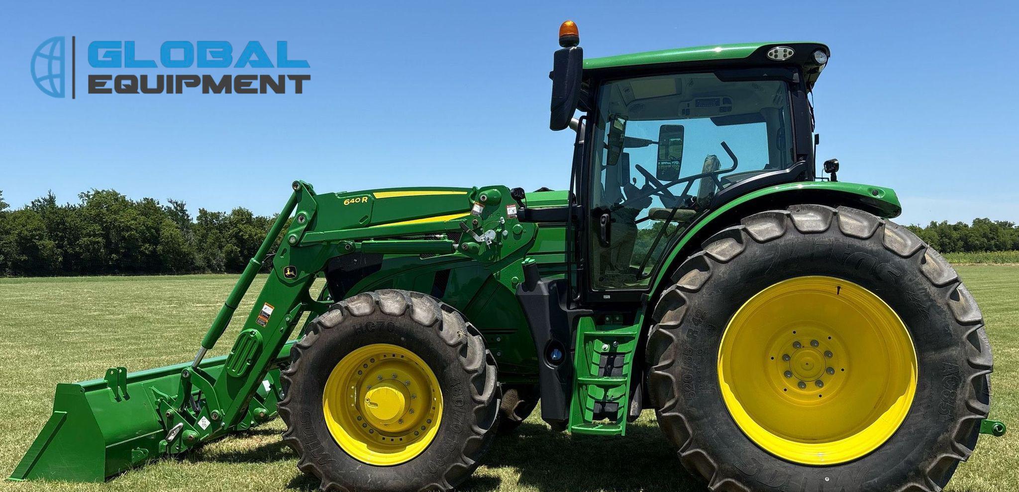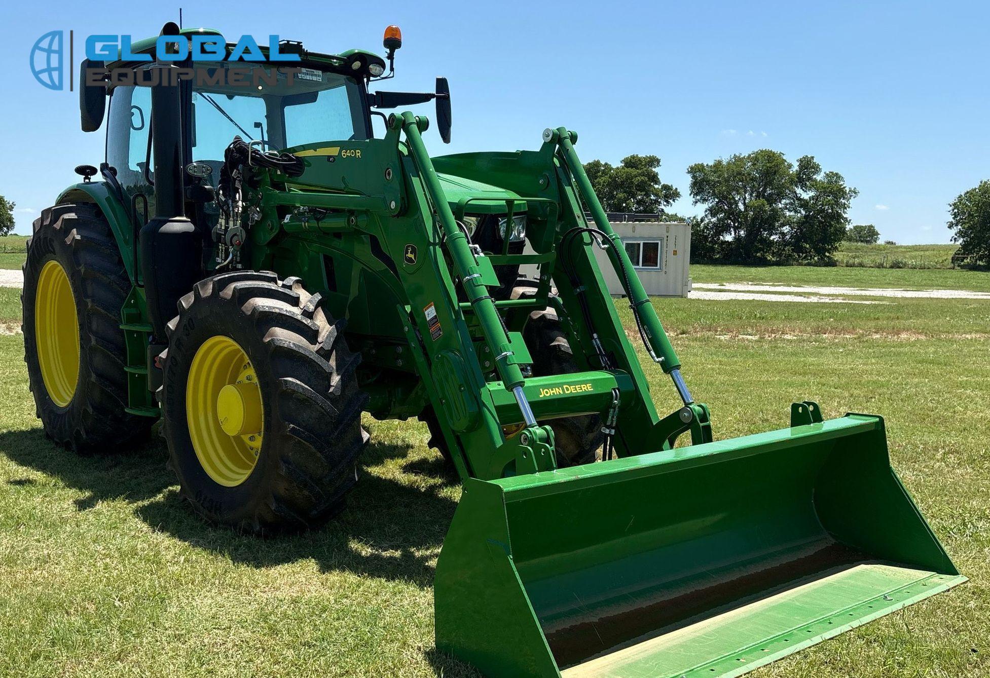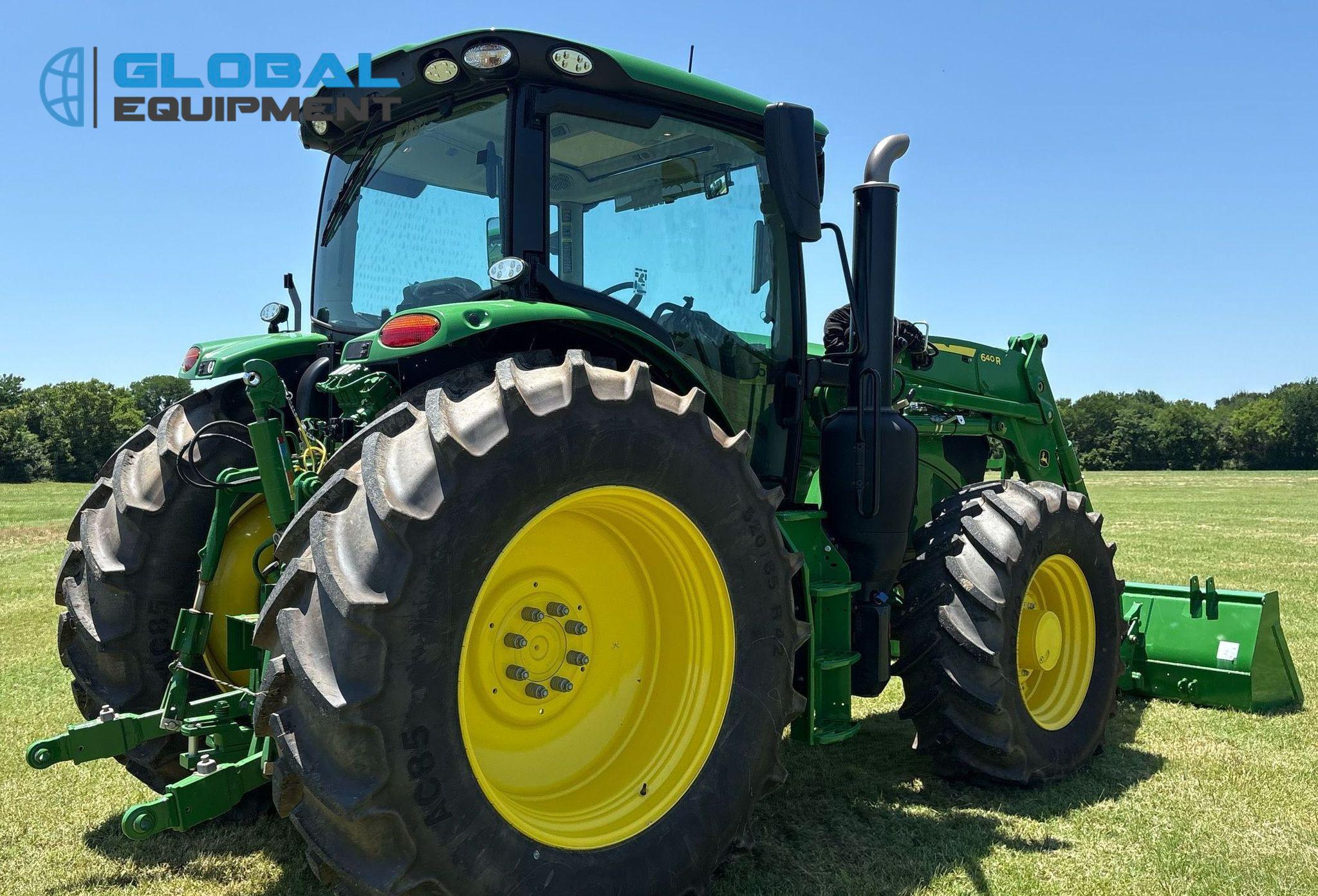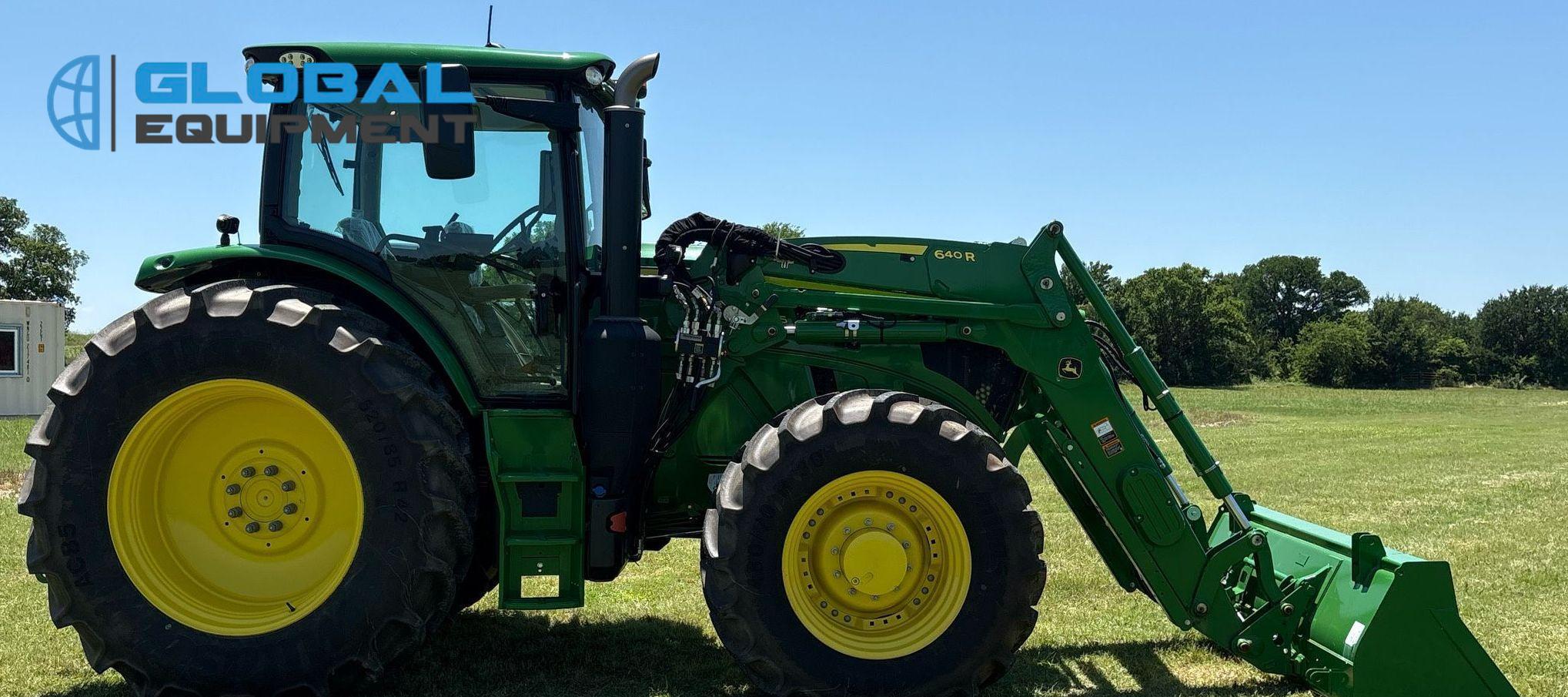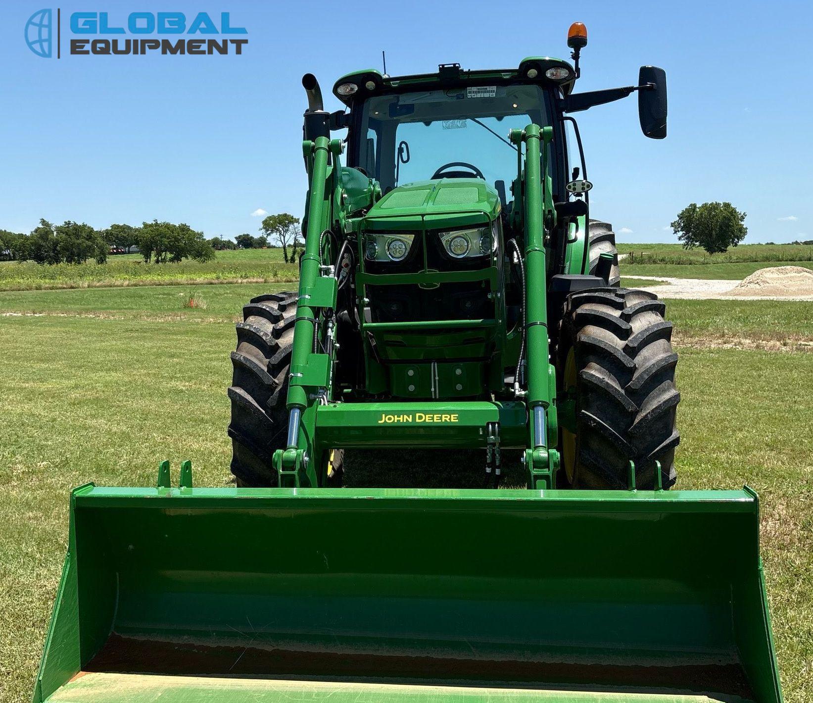 2024 John Deere 6R 145 MFWD tractor, 55 Hours on meter, IVT Transmission with Left-Hand Reverser and Differential Lock, Equipped with AC, Heat, and Auto Steer. Features 540 PTO, Three-Point Hitch with Top Link, 7-Pin Outlet, ISOBUS Outlet, 3 Rear Hydraulic Remote Sets, and John Deere 640R Loader (Quick Attach, Self-Leveling, Joystick Controls) with 99" Bucket. Riding on Front 480/70R30 and Rear 520/85R42 Tires.