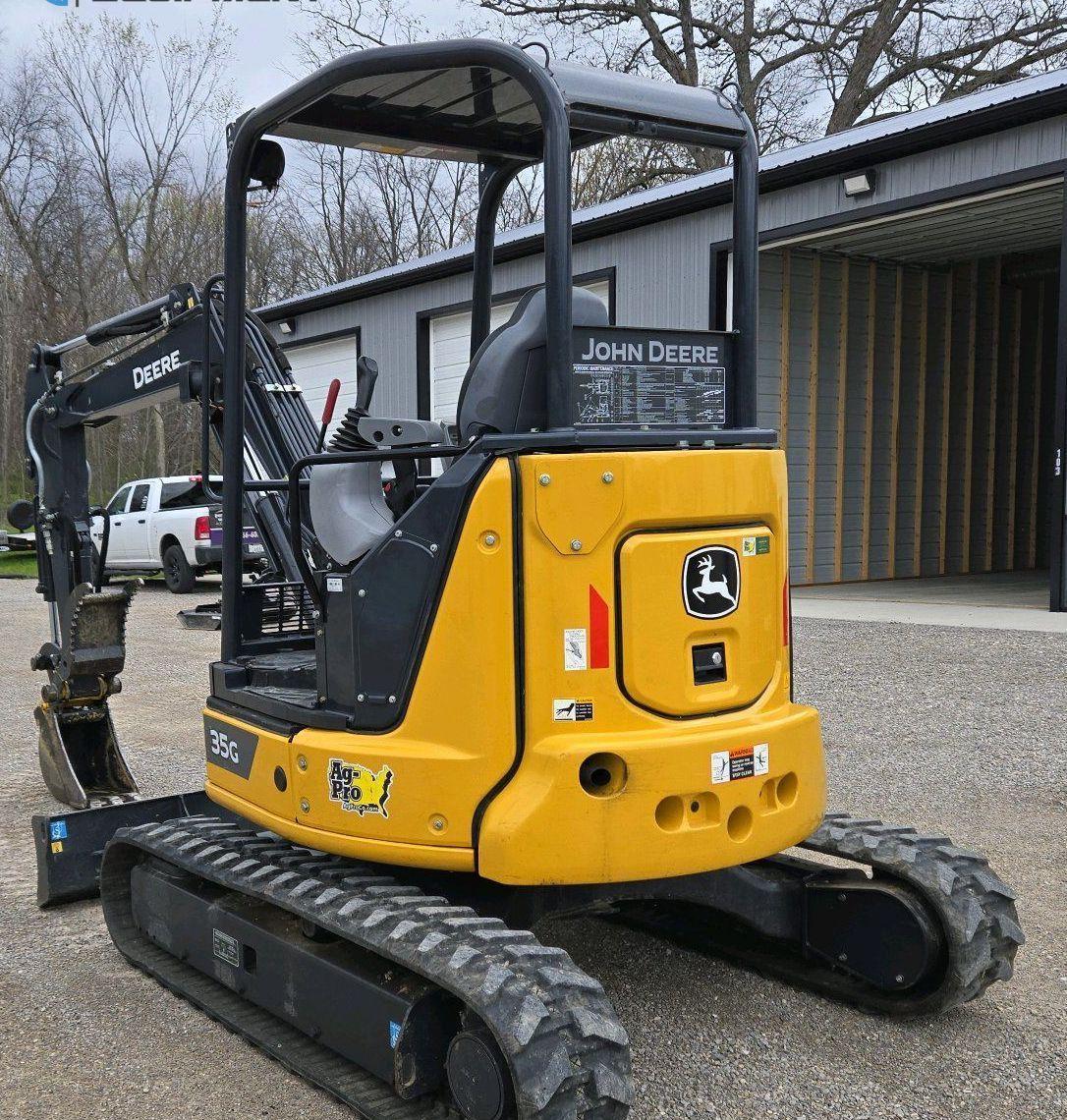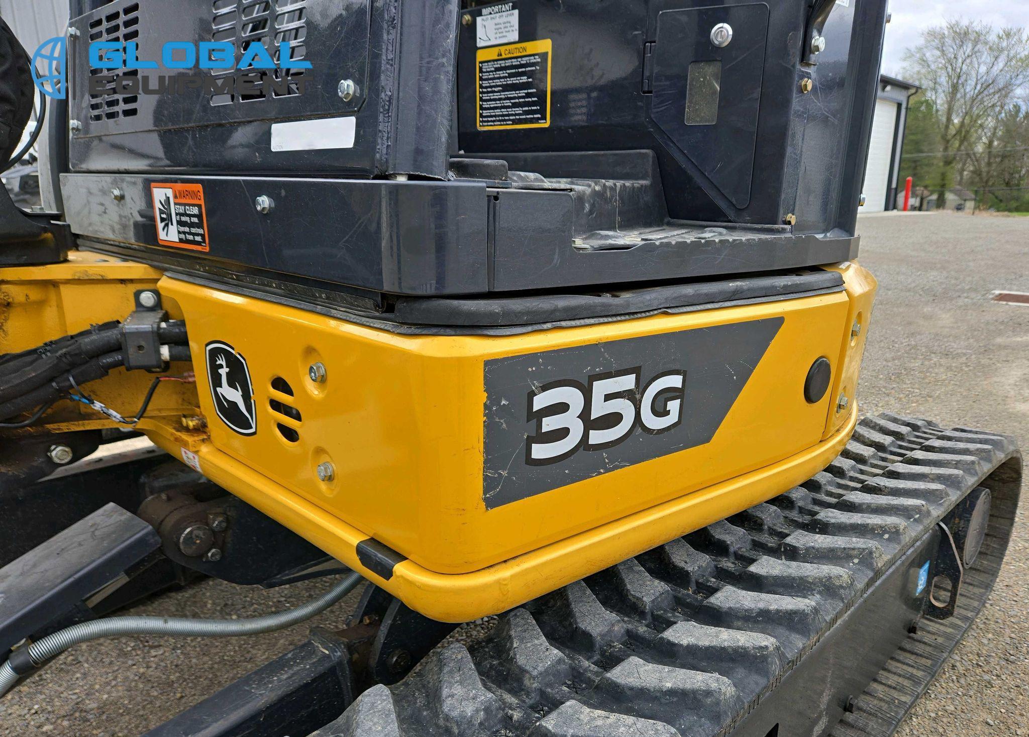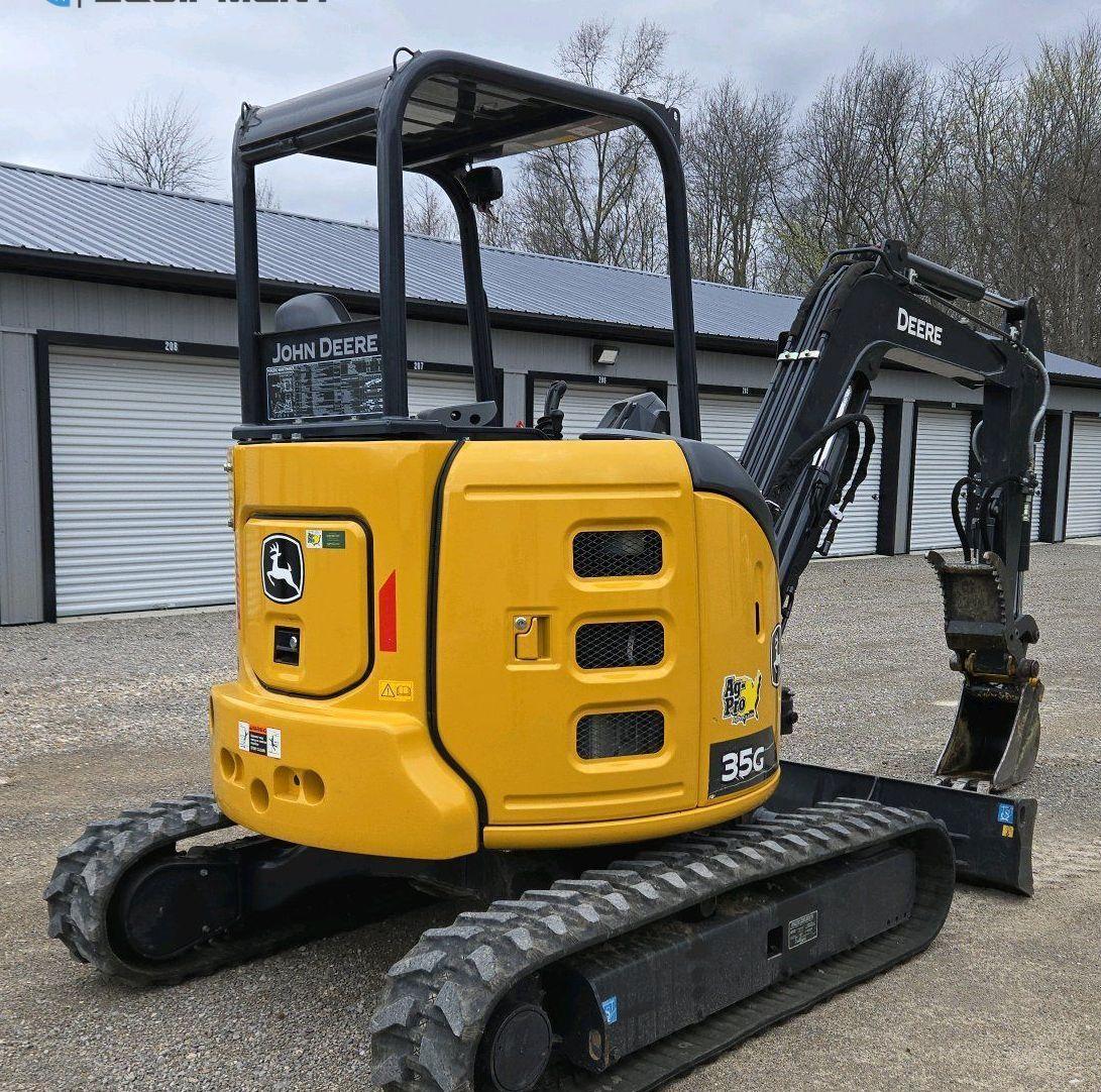 2021 John Deere 35G Mini Excavator, 230 hours on meter, Equipped with Yanmar 3-Cylinder Diesel Engine, Hydrostatic Transmission with Two-Speed Travel, OROPS Operator Station with Pattern Changer, Auxiliary Hydraulics, and 69" Backfill Blade. Stick length 4' 4", Mechanical Quick Coupler, and Hydraulic Thumb. Includes Buckets: 12" with 3 Teeth and 34" Width. Riding on 11.5" Rubber Tracks.