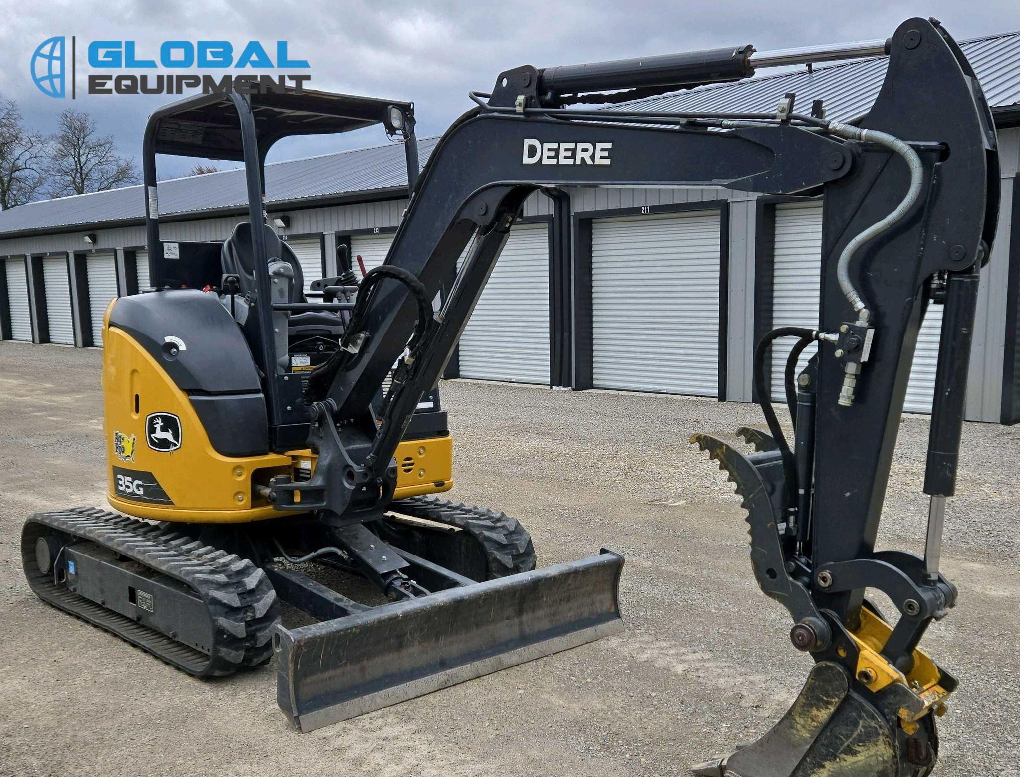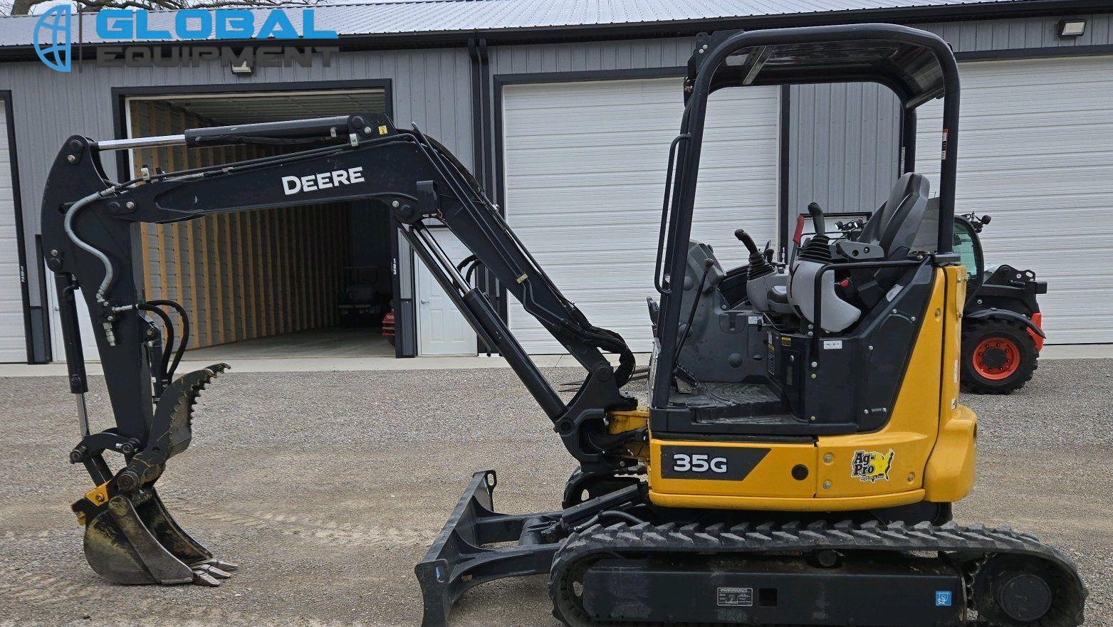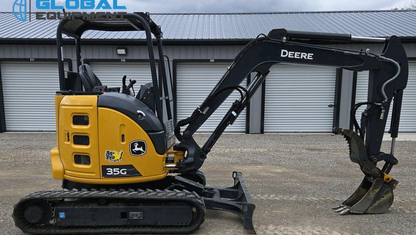 2021 John Deere 35G Mini Excavator, 230 hours on meter, Equipped with Yanmar 3-Cylinder Diesel Engine, Hydrostatic Transmission with Two-Speed Travel, OROPS Operator Station with Pattern Changer, Auxiliary Hydraulics, and 69" Backfill Blade. Stick length 4' 4", Mechanical Quick Coupler, and Hydraulic Thumb. Includes Buckets: 12" with 3 Teeth and 34" Width. Riding on 11.5" Rubber Tracks.