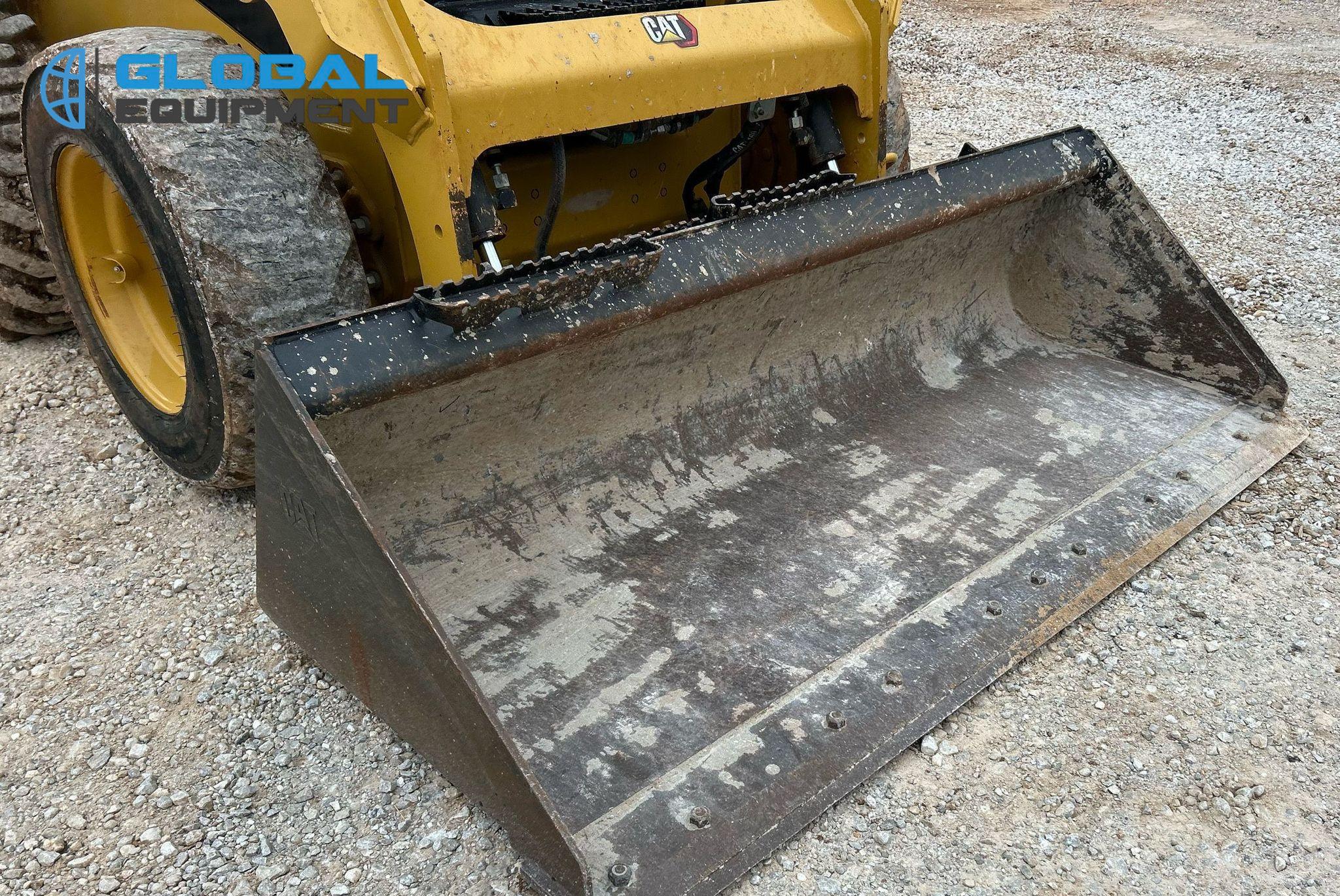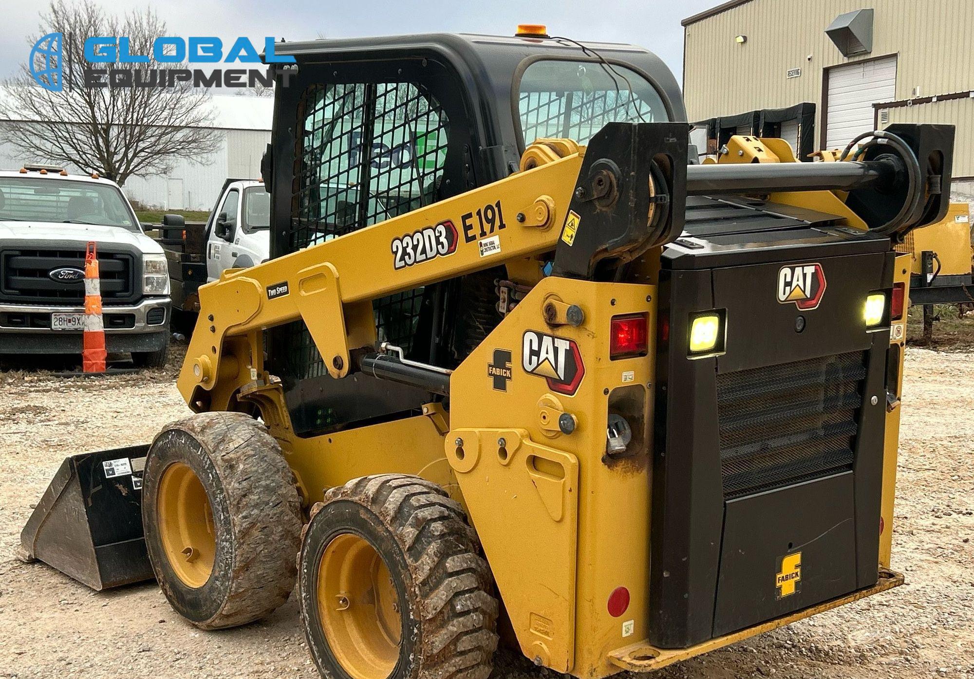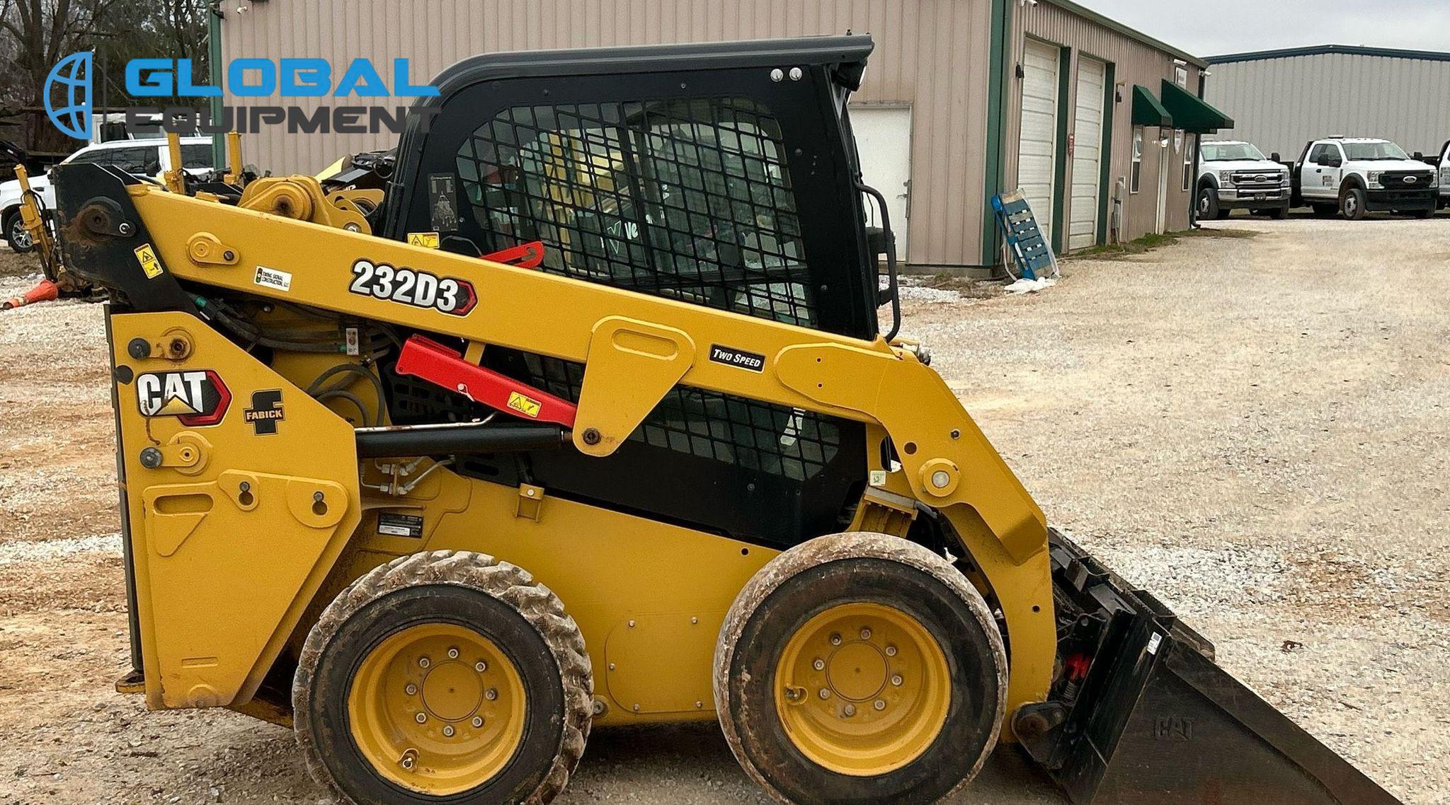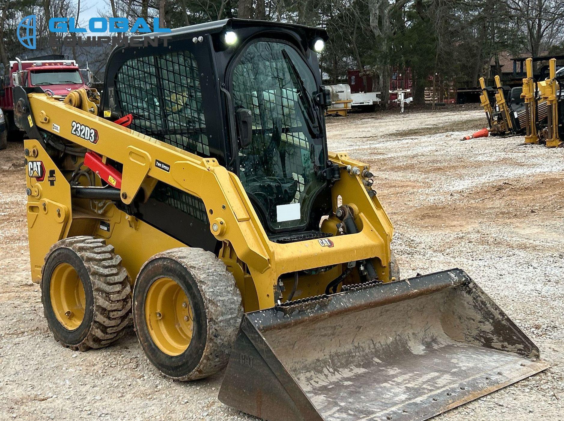 2022 Caterpillar 232D3 Skid Steer Loader, 597 hours on meter, Equipped with Caterpillar 4-Cylinder Diesel Engine, Hydrostatic Transmission with Two-Speed Travel, Enclosed Cab with AC, Heat, Backup Camera, Hand Bucket Controls, and Electronic Monitoring System Panel. Features Auxiliary Hydraulics, Auxiliary Electrical Outlet, Hydraulic Quick Coupler, and Counter Weights. Includes Caterpillar 74" Bucket with Bolt-On Cutting Edge. Riding on 10-16.5 Tires.