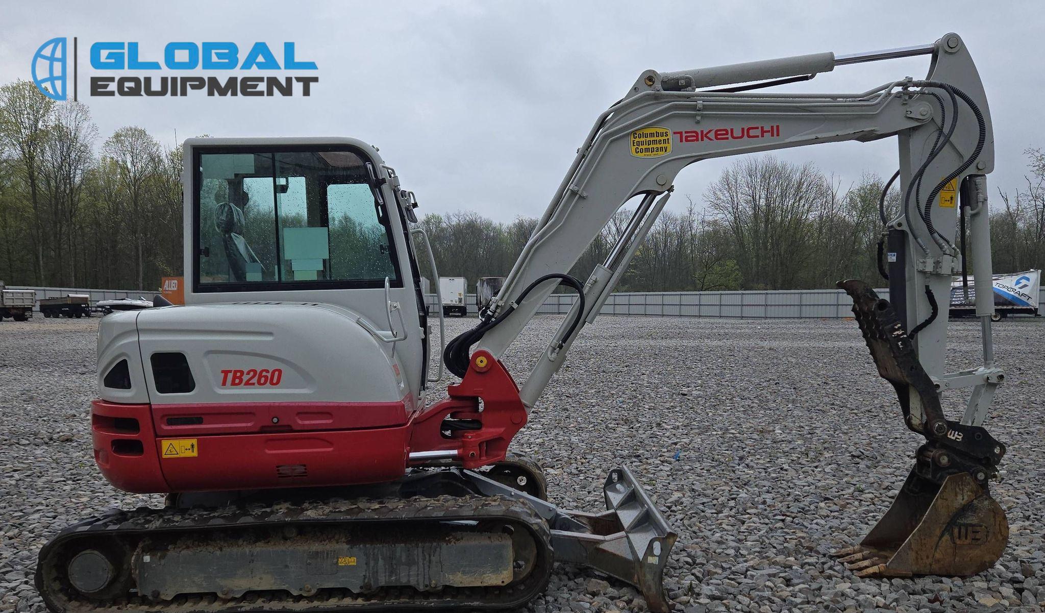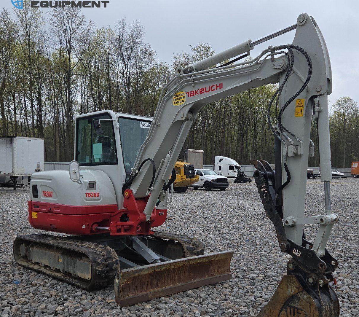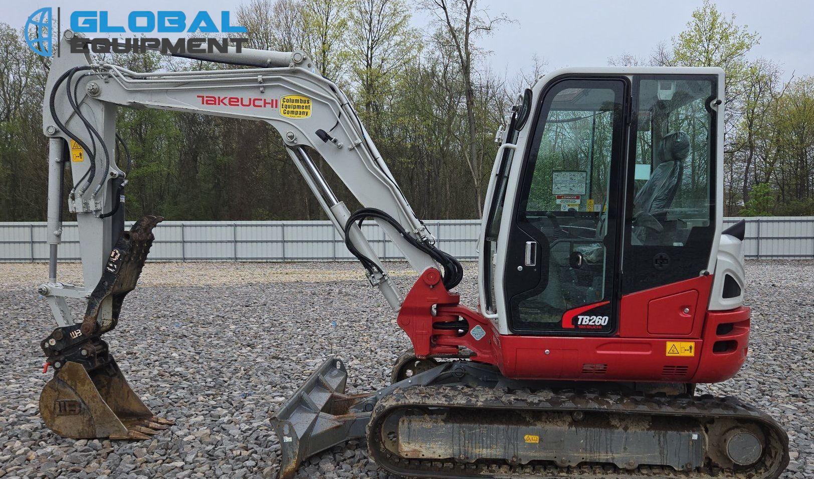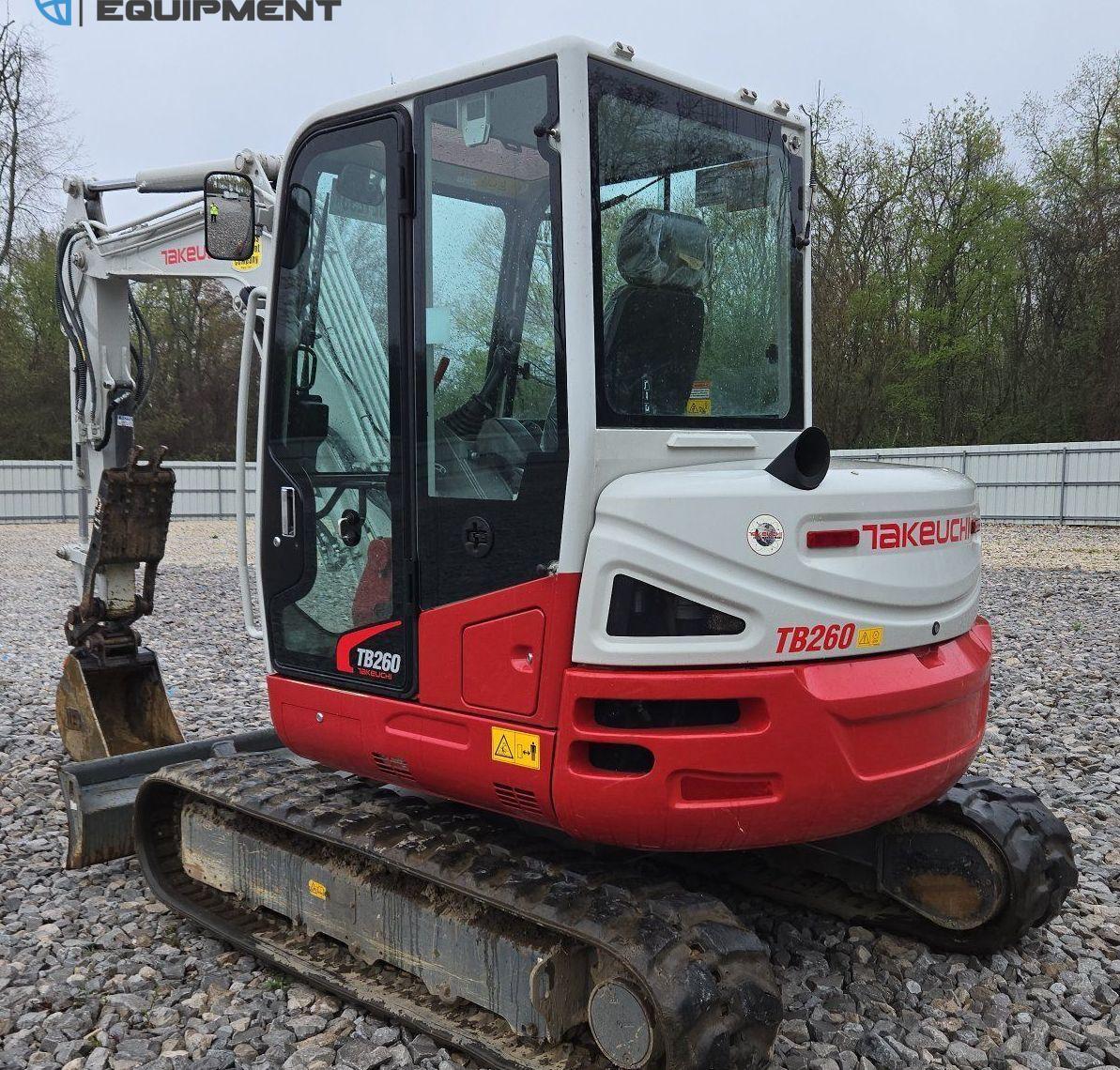 2022 Takeuchi TB260 Mini Excavator, 1,142 hours on meter, Equipped with Yanmar 3-Cylinder Diesel Engine, Hydrostatic Transmission with Two-Speed Travel, Enclosed Cab with AC, Heat, and Pattern Changer. Features Auxiliary Hydraulics, 78" Backfill Blade, Swing Boom, 5' 10" Stick, Mechanical Quick Coupler, and Hydraulic Thumb. Includes Buckets: 19" (4 Teeth), 12" (3 Teeth), 37" (6 Teeth), and 49" with Bolt-On Cutting Edge. Riding on 15.5" Rubber Tracks.